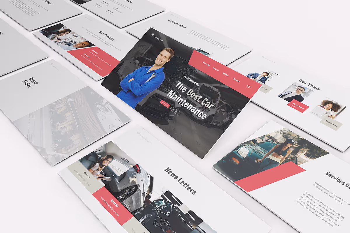 One of the PowerPoint template design inspirations you can follow is from Formatika Studio, the Car Repair PowerPoint Template. It can provide a brief explanation about your repair shop, services, client testimonials, the mechanics, and the gallery of the shop. Its clean design with eye-catching fuchsia highlight makes it perfect to have the audience’s attention.