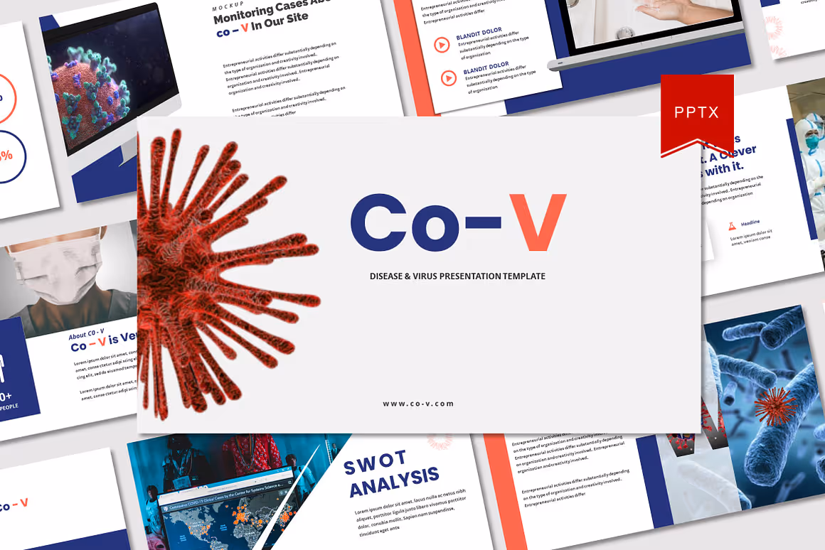 Creating disease presentation can be super fun with this template. CoV give the best visualization of how virus and disease work. This presentation has a vibrant color combination that puts red and blue together. Thanks to the fascinating images and graphics used here. So that, this beautiful template can convince and inform people at once. You can amuse your audience easily with this template.