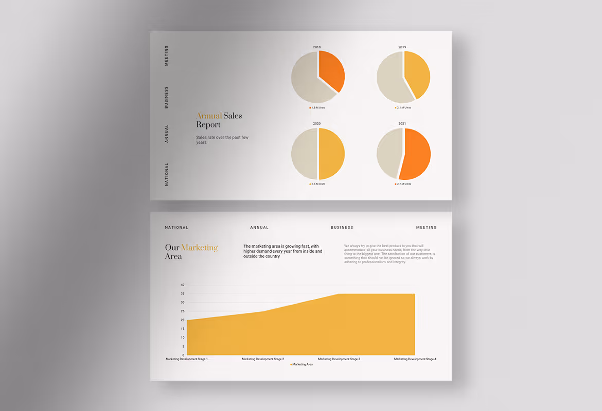 Using yellow, the honey-like color, on the template makes it more eye-catching that will keep the audience stay focused on your presentation. With the various charts and graphs provided, you can deliver the information which involves a lot of numbers and data more understandable so it will be well-received by the audience. The well-organized layout of this template helps you create a neat presentation that is presentable and outstanding. Make your presentation successful in front of your supervisors or clients using this template.