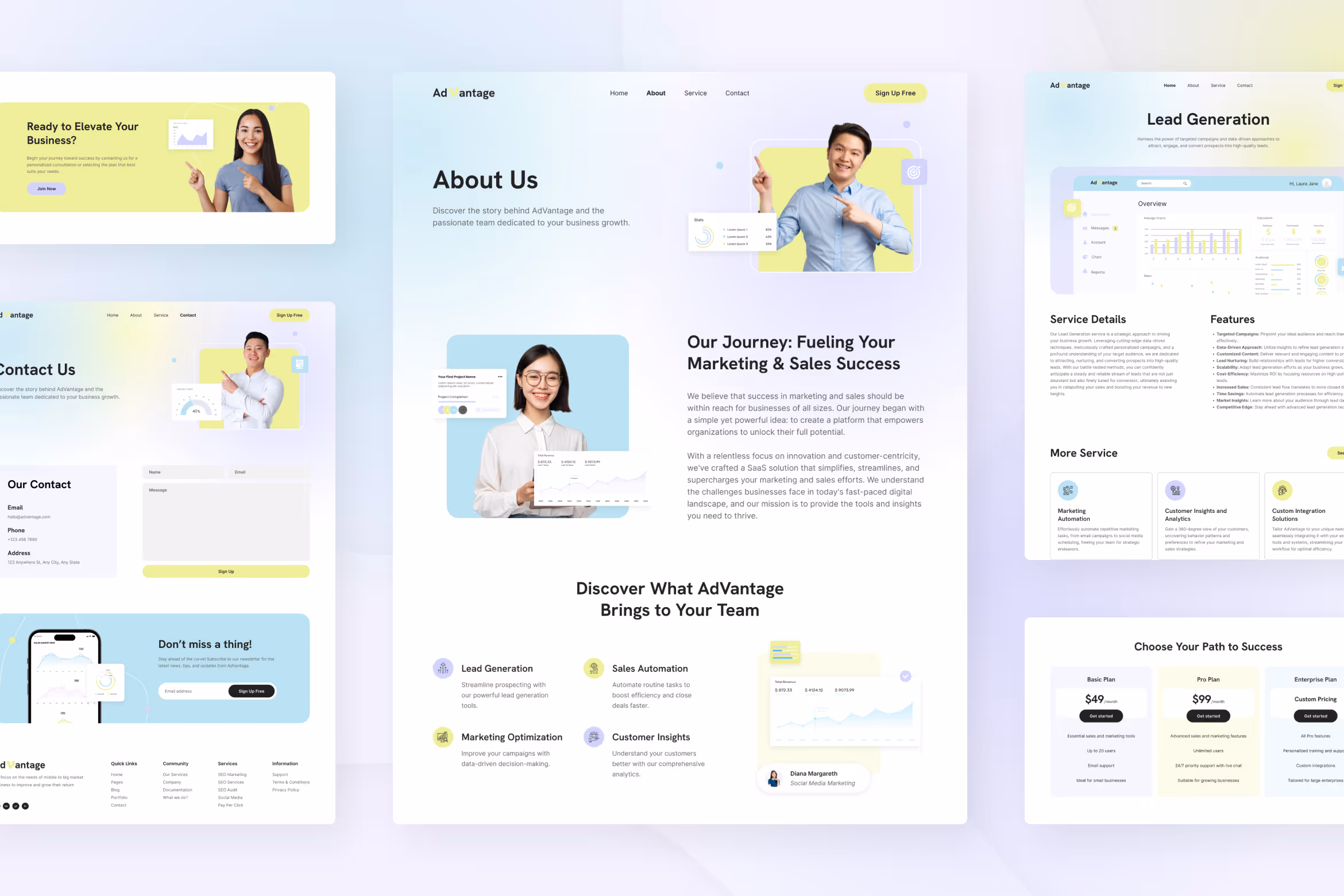 Get the extended version of the clean landing page from AdVantage in this mini SaaS website UI Figma template for a more compelling look. This template version provides you with more than a homepage because it also gives you a template for the about, service, service detail, and contact page. It maintains a clean layout with a friendly interface. So, anyone can access and explore the website comfortably.