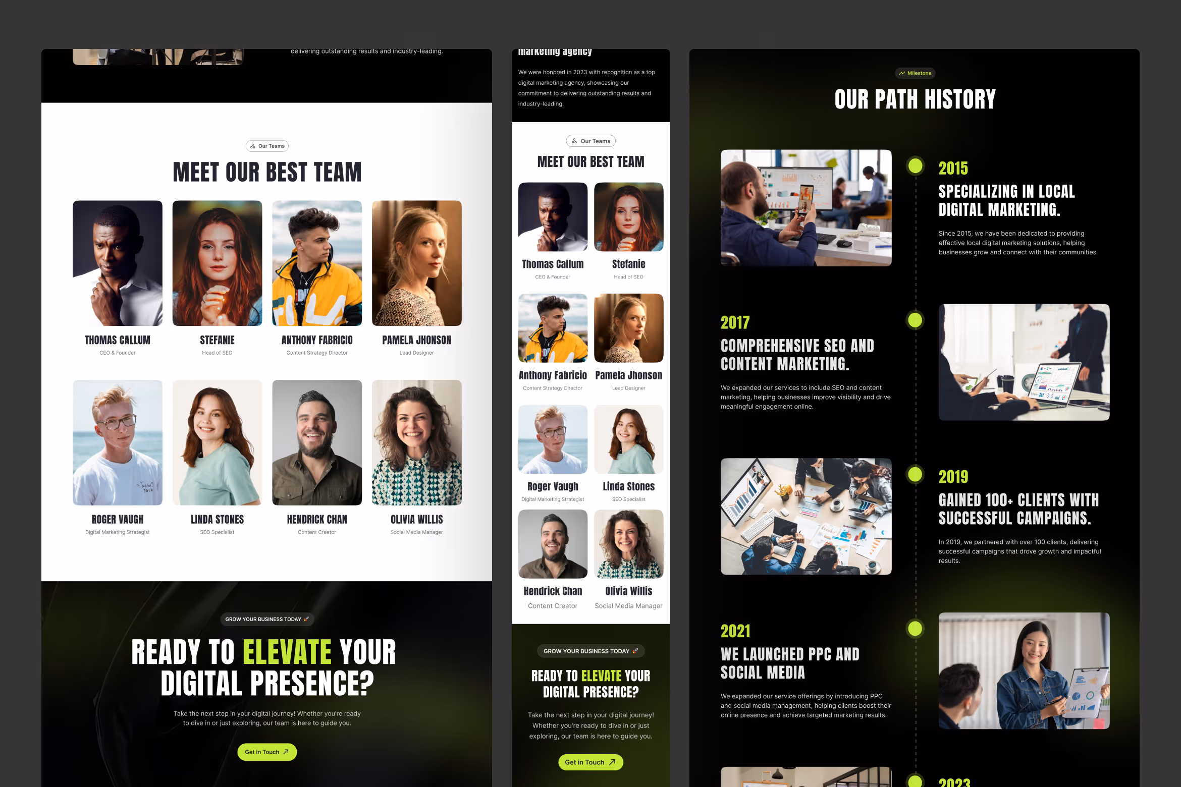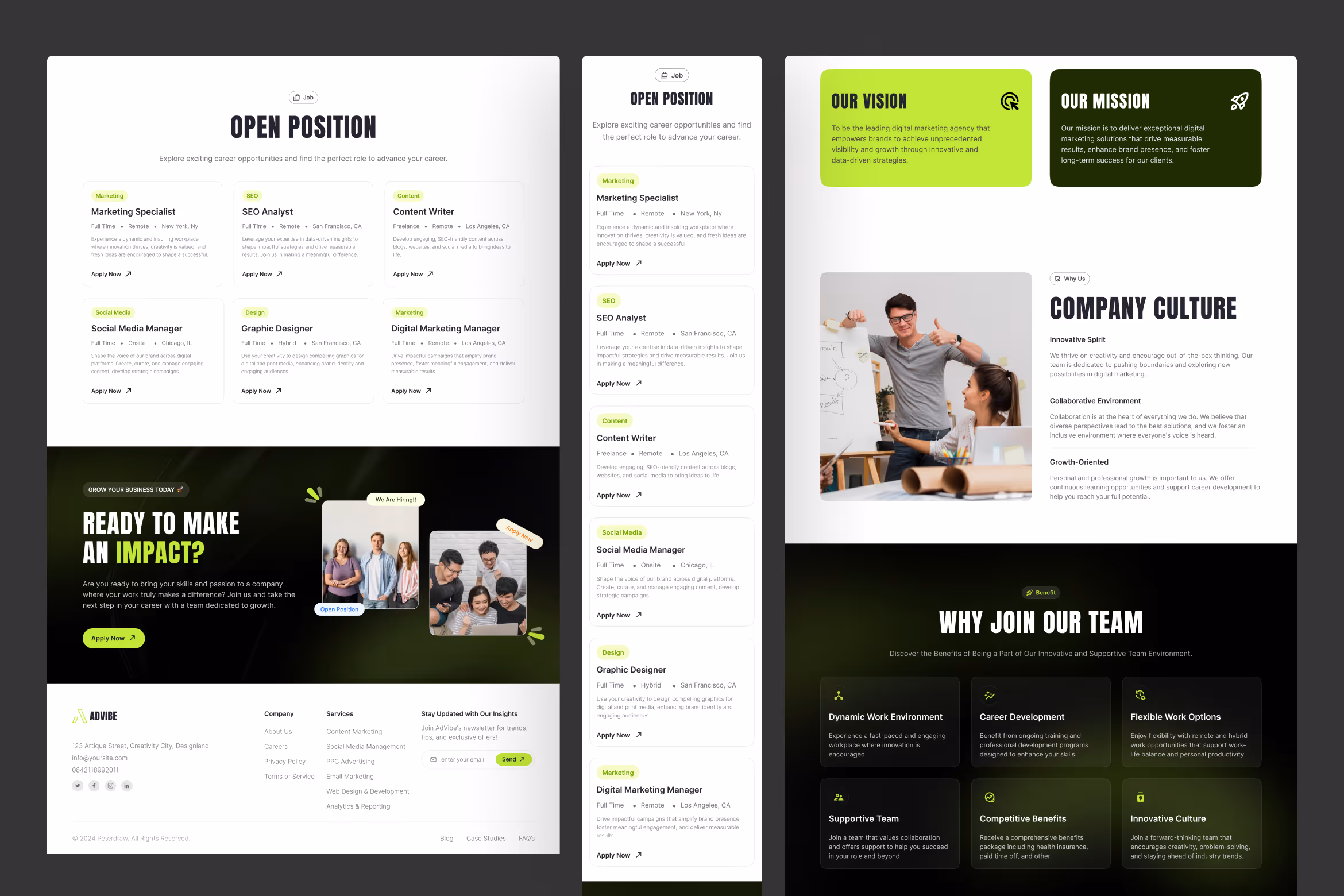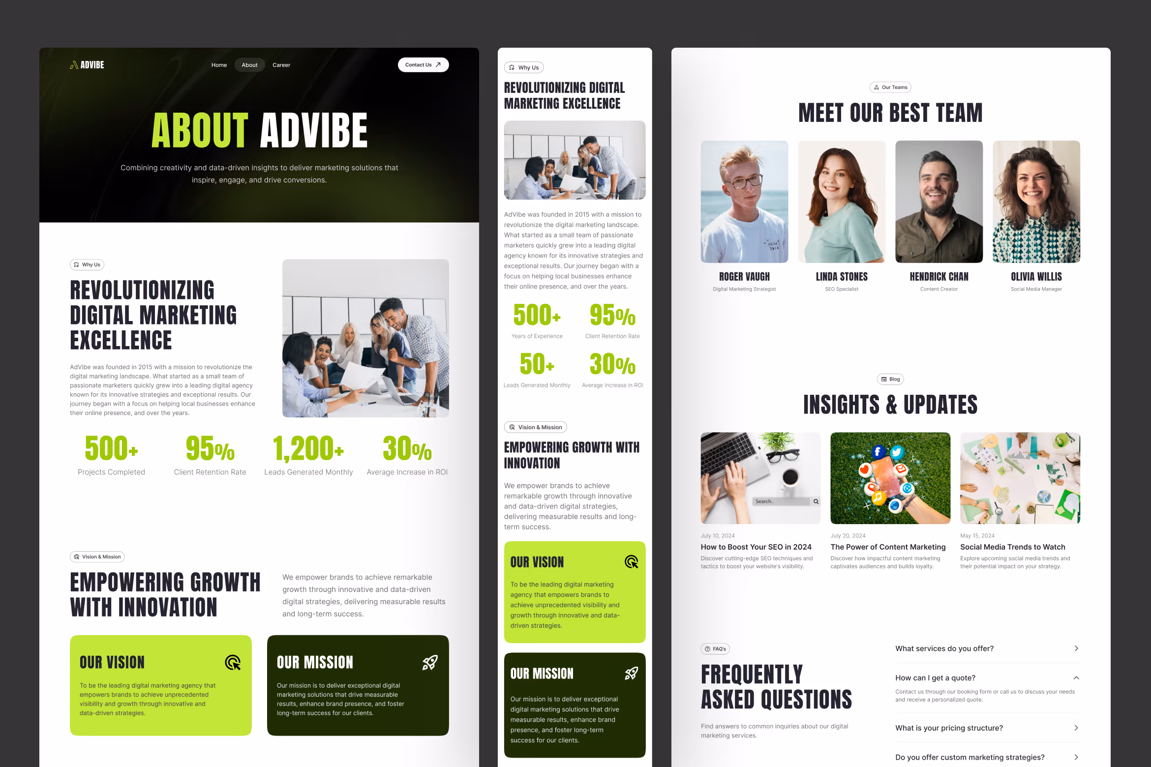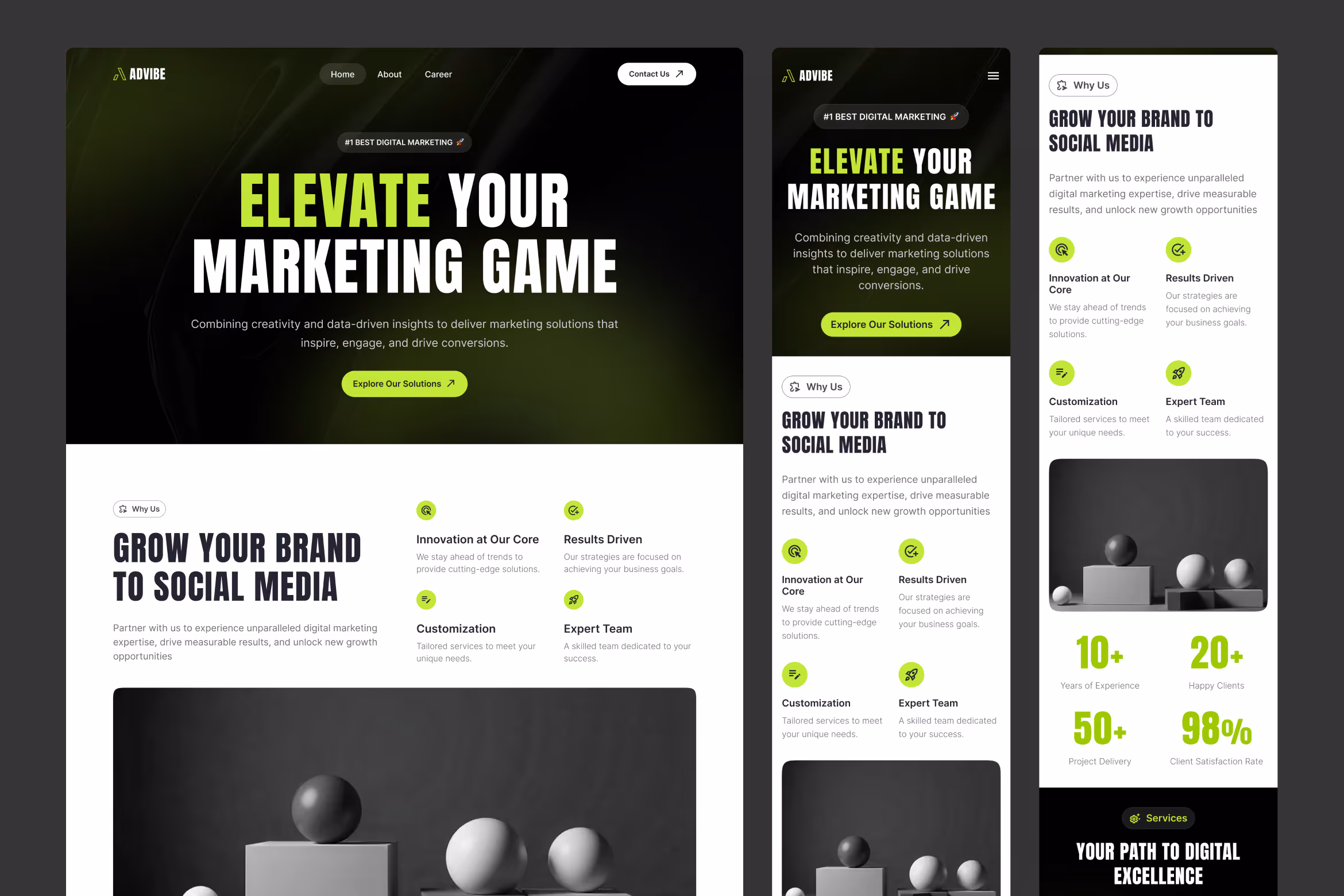 Elevate your agency’s digital presence with the AdVibe Digital Marketing Agency Website UI Figma Template, crafted to make a lasting impression. This comprehensive template is available in both desktop and mobile versions. Its bold black and vibrant green color palette creates a modern, high-energy vibe, while the clean, structured layout ensures effortless navigation and user engagement. Ideal for digital marketing agencies, AdVibe features standout elements. With its polished design and functionality, this template is your key to building a powerful online presence.