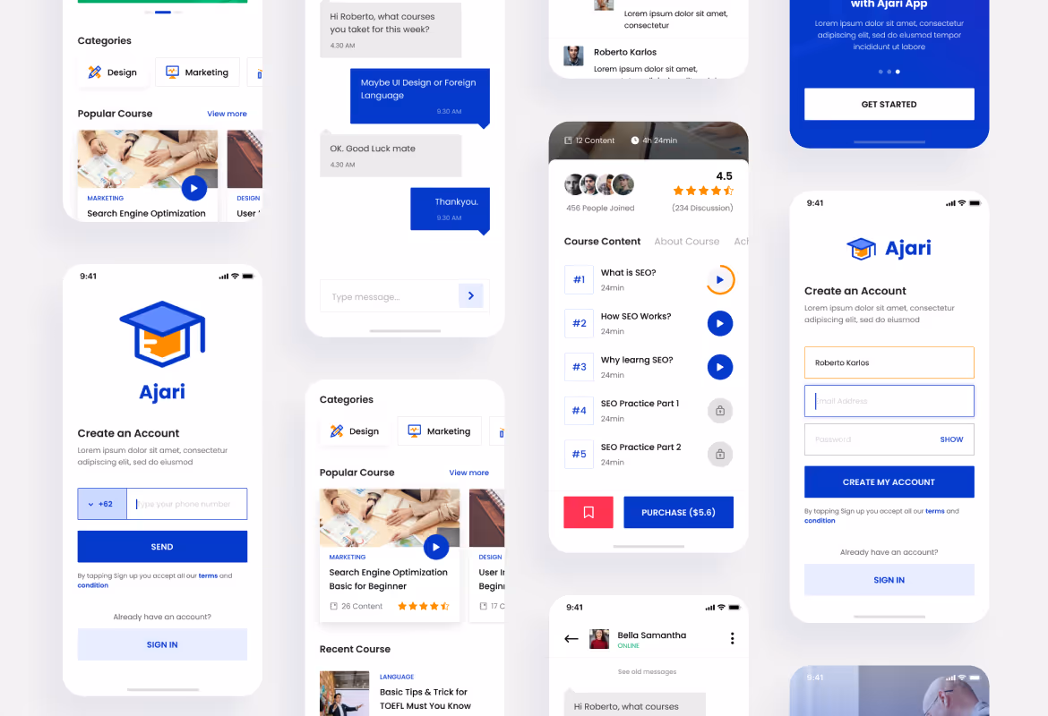 Modern iOS User Interface design template for an e-learning app. This template is ideal for an online course app, e-learning app, education app, school app, and any course app. Make your app design looks stunning and eye-catching using this template. This template includes 15 unique and modern User Interface screens in PSD and Figma format. You can edit and customize easily using Adobe Photoshop and Figma.
