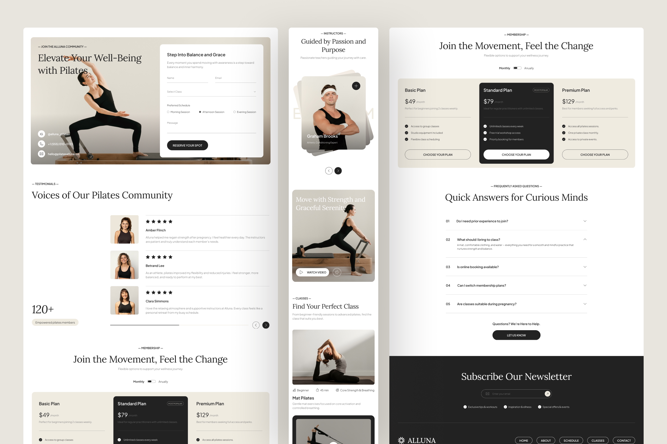 Find balance, strength, and harmony with Alluna, a serene and modern Pilates Studio Landing Page crafted in Figma. Designed for pilates studios, yoga centers, wellness brands, and fitness instructors, it helps you create a digital experience that embodies mindfulness and movement. With a soft aesthetic and intuitive structure, this landing page inspires users to explore classes, connect with trainers, and take the first step toward a healthier lifestyle.