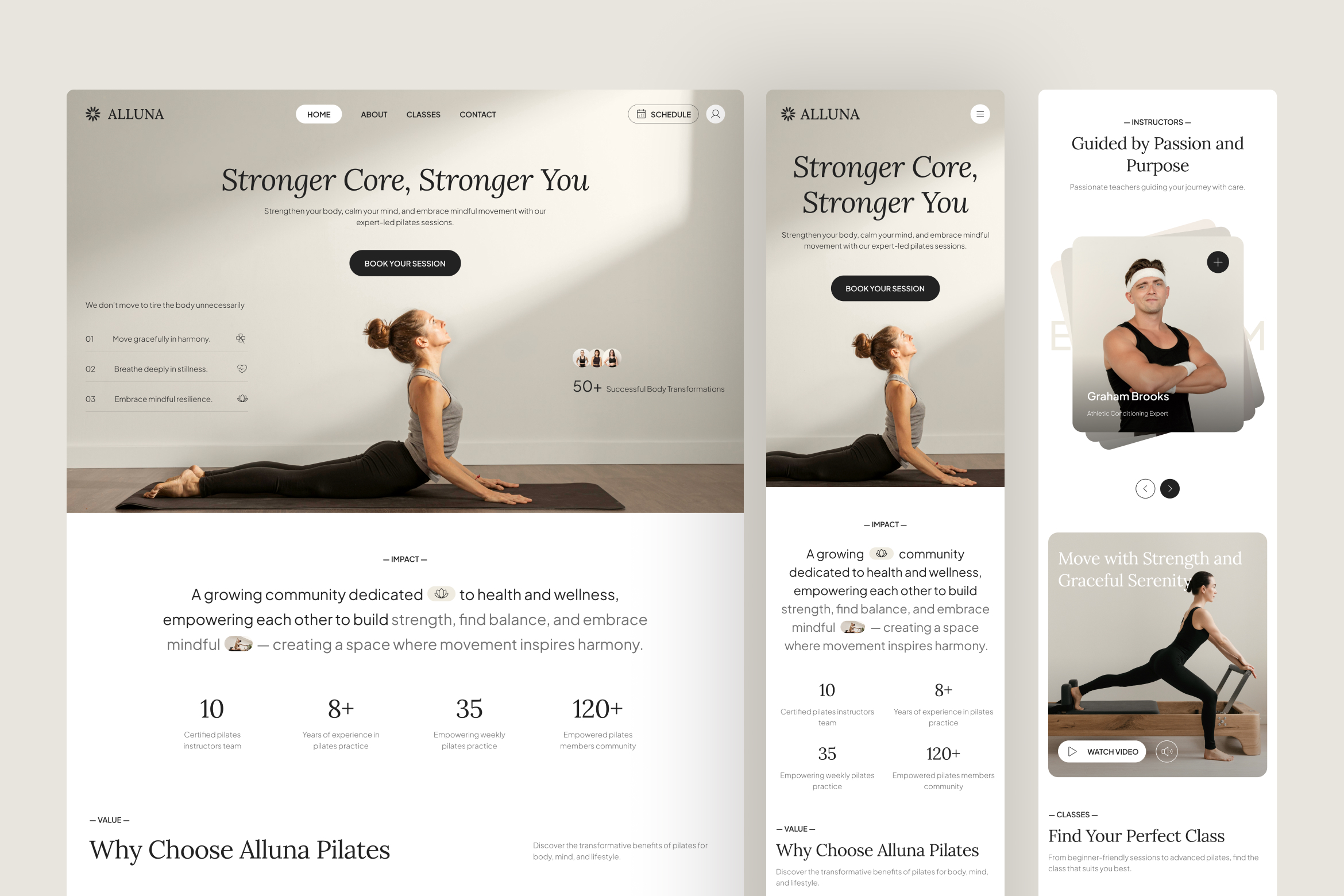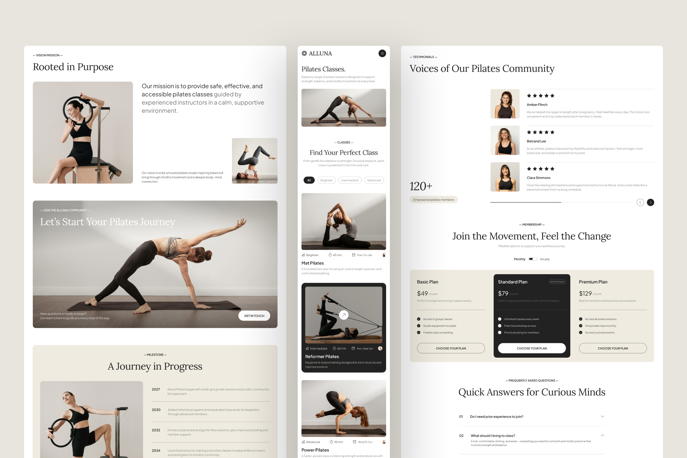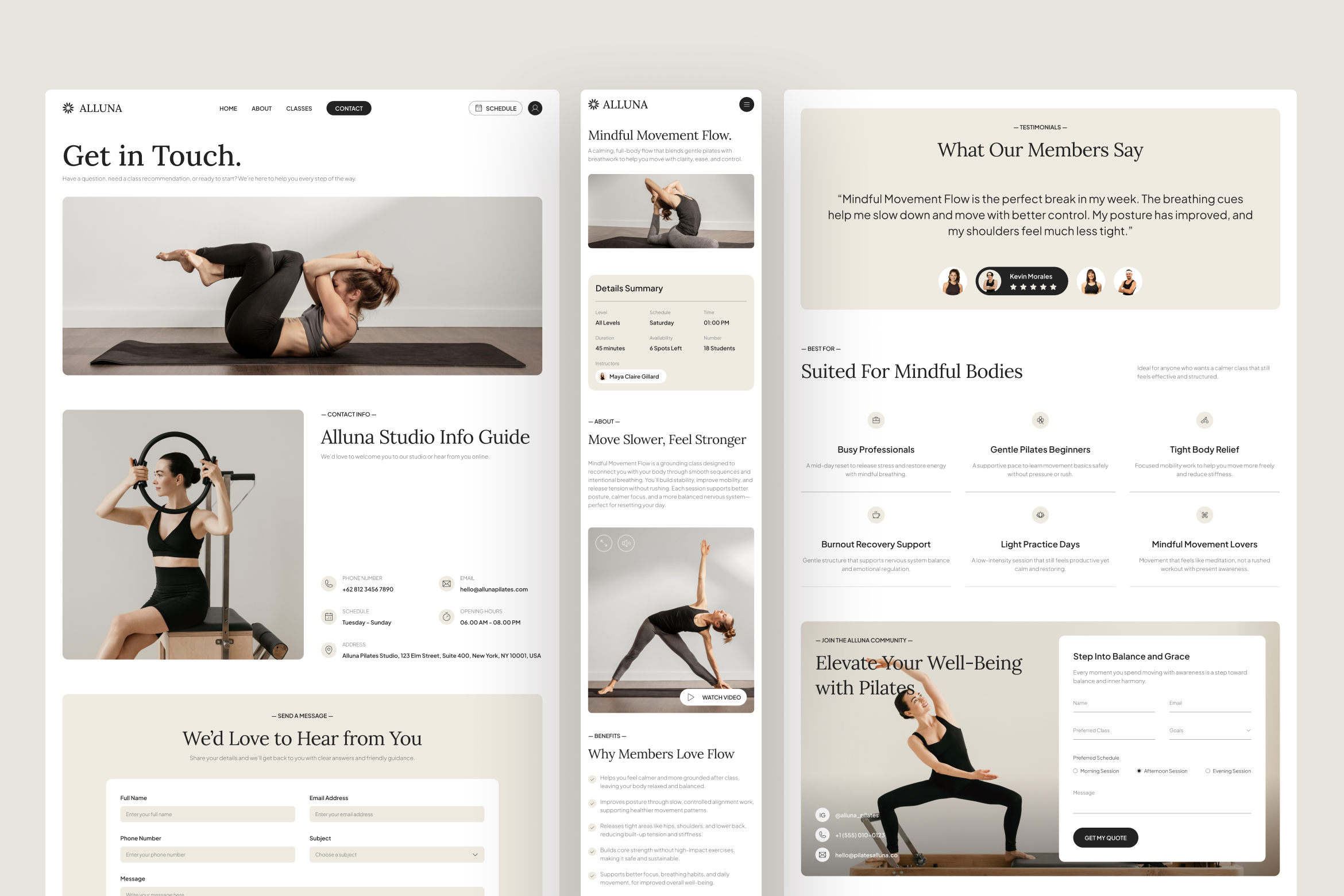 Pilates and mindful movement are grounded in control, awareness, and balance and Alluna is designed to reflect those values across the entire website experience. The interface emphasizes calm pacing, visual clarity, and intentional structure, allowing visitors to absorb information comfortably without feeling rushed or overwhelmed. Clean layouts, readable typography, and generous spacing create a sense of focus and trust, while the overall flow gently guides users from curiosity to engagement. Rather than pushing action, it supports confident decision-making through subtle cues and thoughtful design, making it an ideal foundation for Pilates studios and wellness brands that value clarity, presence, and purpose.