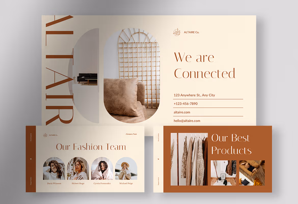 Producing an eye-catching and desirable fashion item cannot depend on your fashion sense alone. To create consistent products, you have to make a guideline to guide your employees in producing them. A compact and well-organized guideline presentation will be very helpful in creating and producing your fashion products. It will be easier to follow and understand when you present the guideline in a more presentable presentation. You can pick Altaire, the brown elegant fashion brand guideline presentation template, from our product list as your fashion brand presentation template.