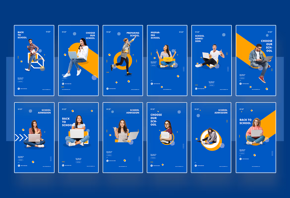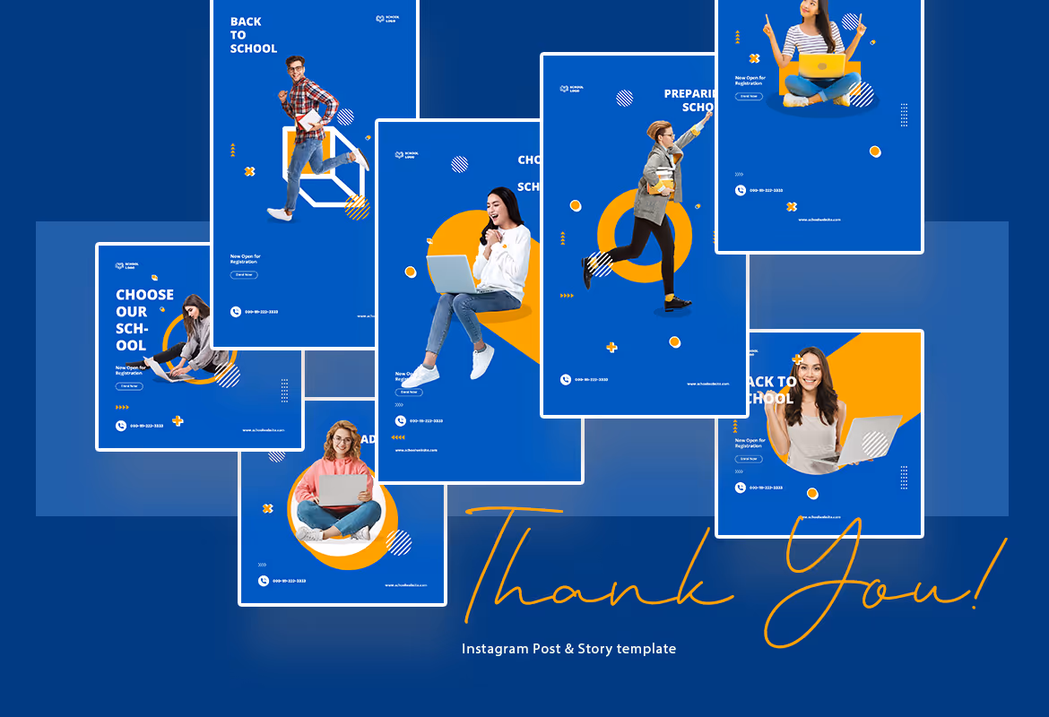Back to School Instagram ads post and story template with a modern style. This template is ideal for junior high school, senior high school, campus, university, and education business. Make your Instagram promotion looks stunning and eye-catching using this template. This template includes 12 unique and cool Instagram posts and Story templates in PSD and AI format. You can edit and customize easily using Adobe Photoshop and Adobe Illustrator.