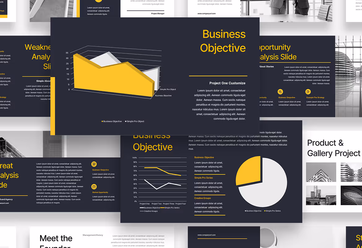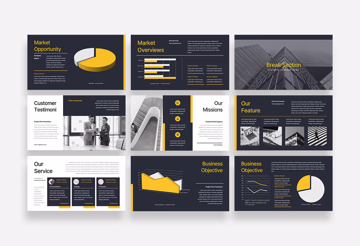 This template will help you bring out the best value and advantages of your company by using well-organized and well-designed layout slides combined with black and white as the main background colors and yellow as an accent that emphasizes every point you deliver. The graphic parts on the slide complement the overall presentation.