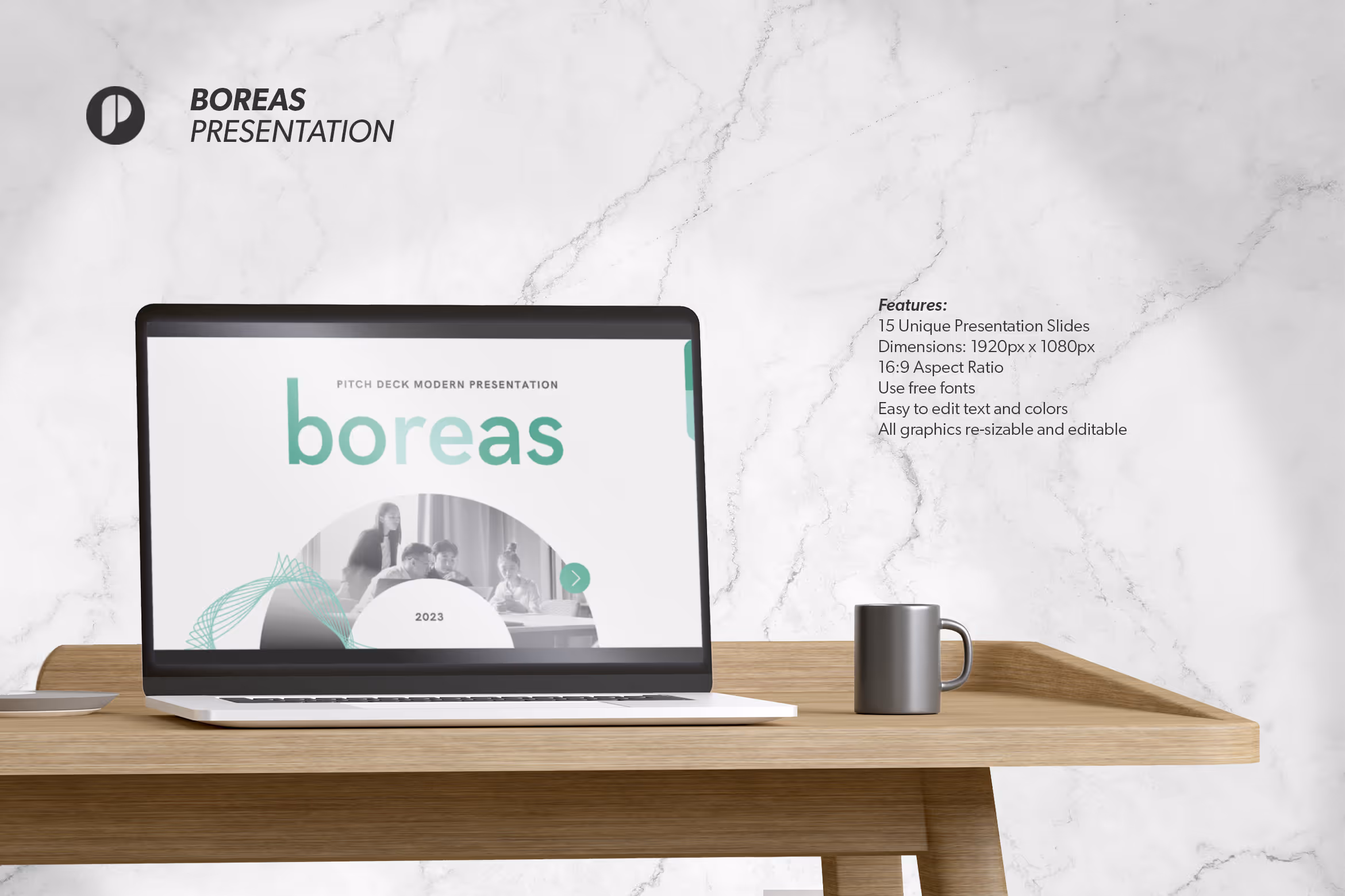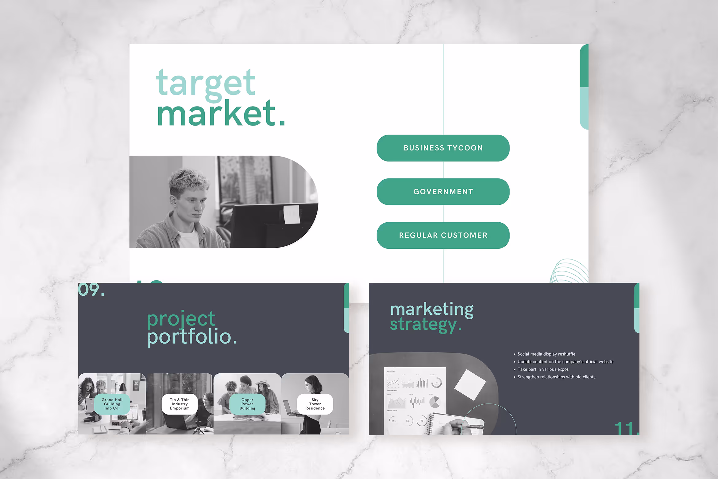 This template has a captivating design template that can grab everyone’s attention at first glance. It adopts a modern and minimalist concept creating a professional and credible image for your business. It combines dark liver, light green, and white, creating a harmonized color combination. Furthermore, it has a well-organized and symmetrical layout that simplifies your presentation. Your audience can quickly get your ideas only with this fascinating presentation template.