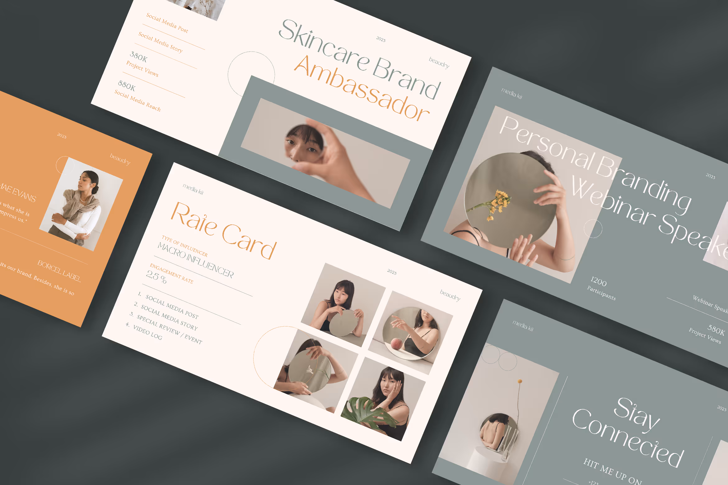 This presentation template has a strong earthy vibe from the combination of broken white, sage, and caramel, which will bring you into the natural atmosphere. Every slide in this template is so well-organized that you can put every piece of information in the provided place without having to think about its positioning, spacing, and sizing anymore. Any influencer can use this template for their media kit presentation, especially in beauty, fashion, and many more.