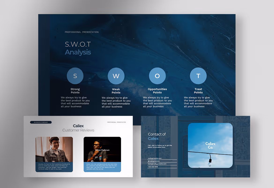 It is an essential thing to have a good performance in your company to increase your company selling point and polish your company image. But, this good performance only will be unknown to your clients and partners unless you give them your company presentation. Create your best presentation with us using Caliex, a deep blue sea professional company presentation template, to capture the heart of your prospective clients, partners even customers. This template is perfect for a company, corporate, start-up, entrepreneur, professional, and other business.
