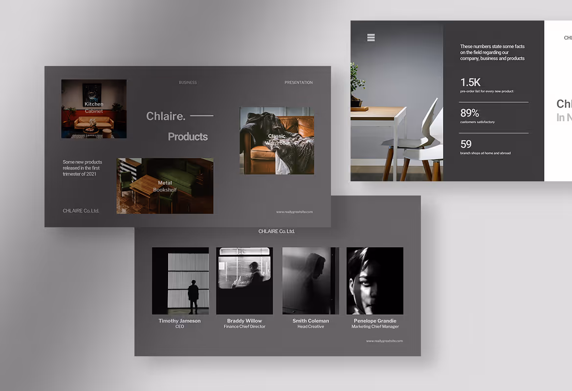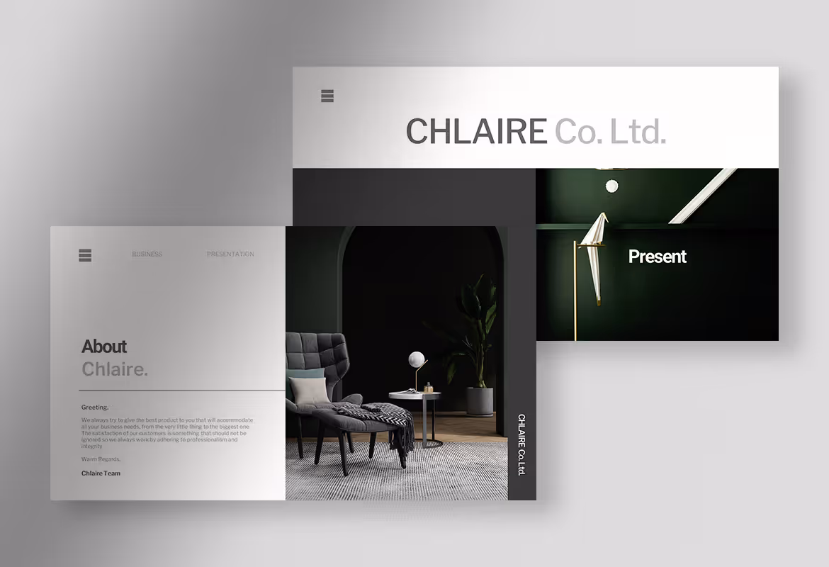 This template has a clean design with a color background of white, black, and gray that can give a professional feel. It provides you with a well-organized slide layout and proportional composition of text that can help you organize the information you need to share neatly. It makes Chlaire suitable for your company profile, project proposal, or business-related presentations. Introduce your company and get more projects using this business presentation to increase your company image and credibility.