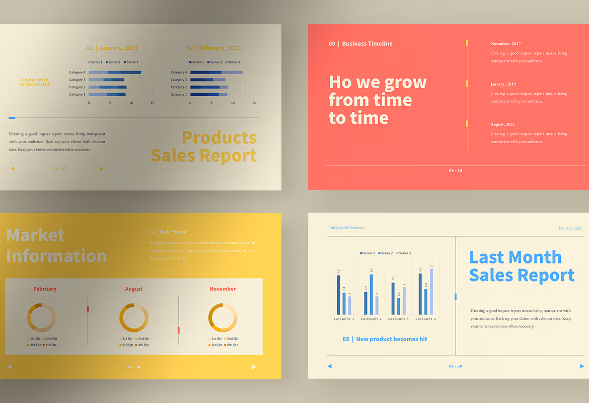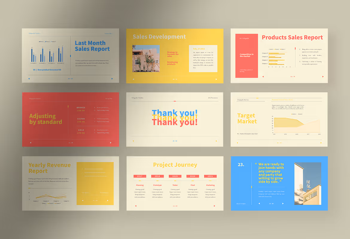 This infographic statistic presentation template provides you with 30 colorful unique slides available in ppt and pptx format files. You can edit the text, images, and color on the template by using Microsoft PowerPoint or any other compatible application on your device. Please use the guidance in ‘Help’ documentation to edit the template.