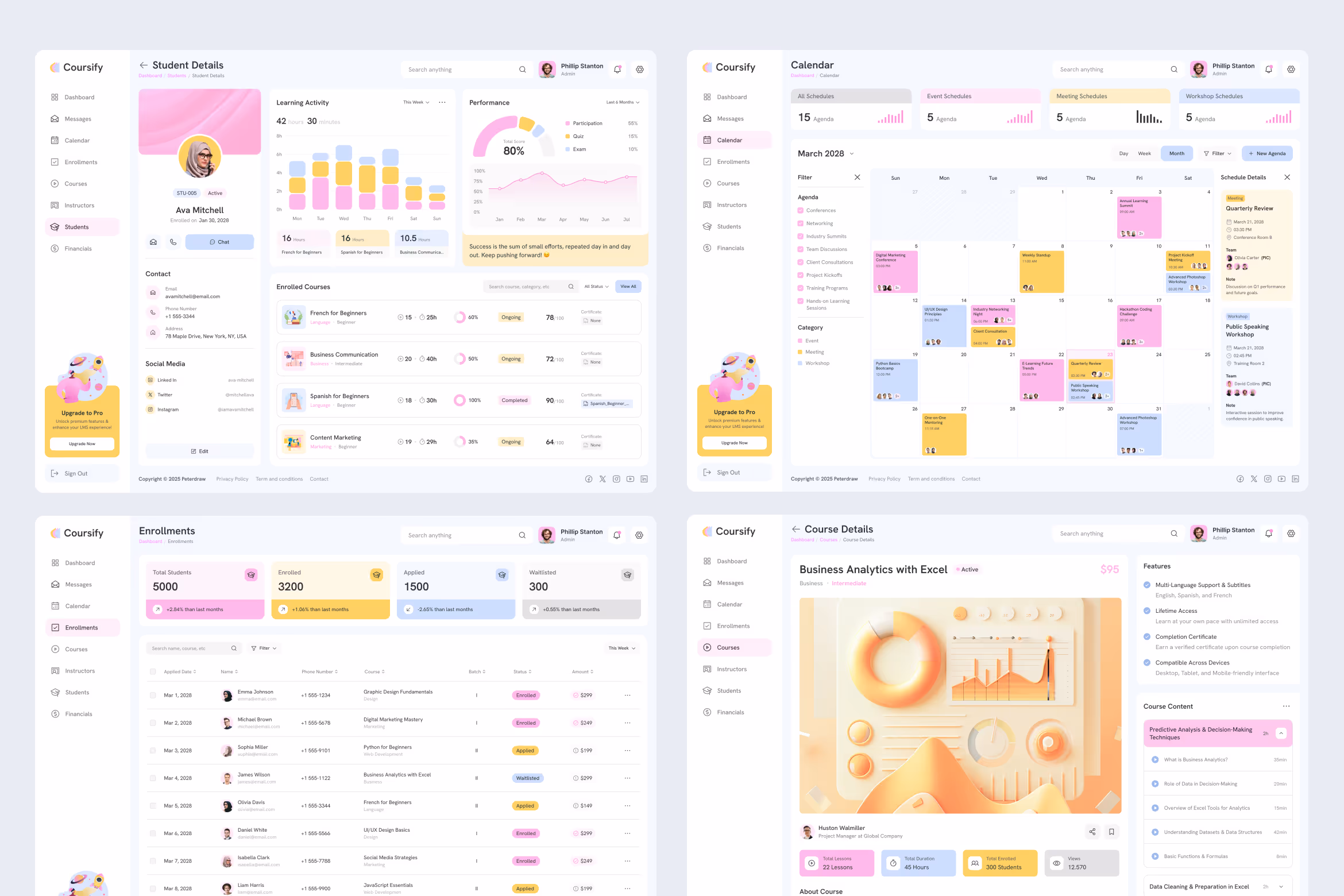 Step into smarter course management with Coursify, a complete learning management system dashboard template built for clarity and control. Designed with twelve polished screens, from dashboard and course listings to instructor and student profiles, it helps you manage your education platform with confidence and style.