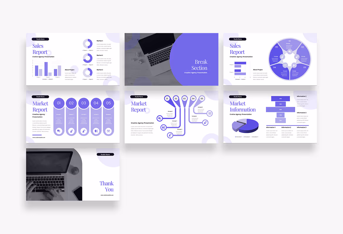 It has a clean and neat design that will bring a good image to your creative agency. The violet color used in every slide makes your presentation elegant and beautiful. This template also comes with an attractive graphic and interesting layout that is suitable for any creative agency and makes your presentation more amazing and outstanding.