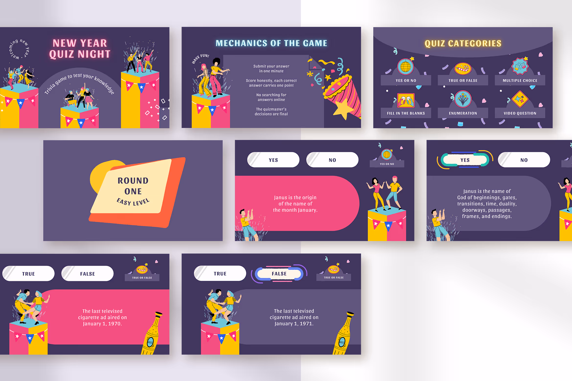 This template uses dark purple as the background to create the best effect and contrast of a cheerful and colorful accent. Besides, it also uses various animations to avoid boring looks and sessions. With a well-organized layout and illustrative appearance, you will be easy to create a neat quiz presentation. Even when you need it for another game session, this template can come in handy. Make your new year’s eve celebration more cheerful and livelier by hosting a quiz night using this template.
