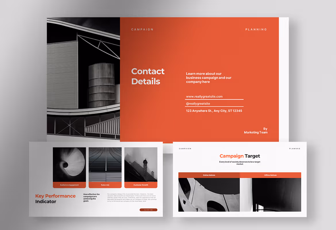 The presentation using this template can support your explanation well because all the information you put in it is well-organized in the space provided. This template also has an eye-catching combination of terracotta shades and white, plus black as a complement that can keep the audience focus. You can put your campaign ideas, strategies, budget and timeline accordingly and make your campaign proposal accepted by your team and supervisors.
