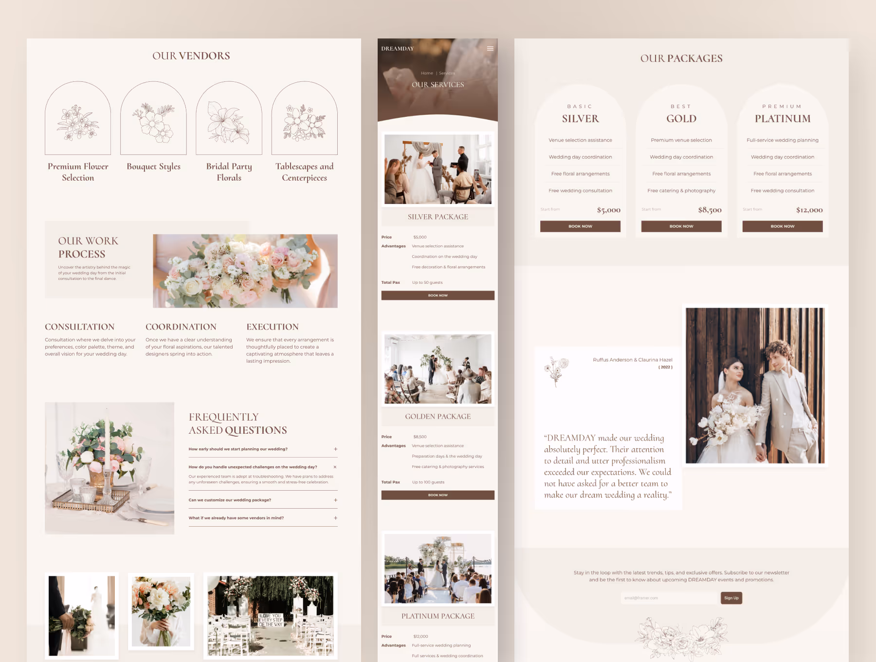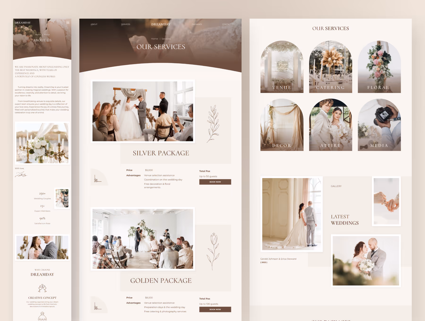 Bring the wedding day your clients dream of to your website using DreamDay, a neat and modern wedding planner website Framer template. Its simplicity makes the website look classier with an elegant and dreamy touch. Beige as the background and brown as an accent strengthen the vibe and are very suitable for wedding planners or organizers. Promote your services well using this template and get more clients to visit the website.