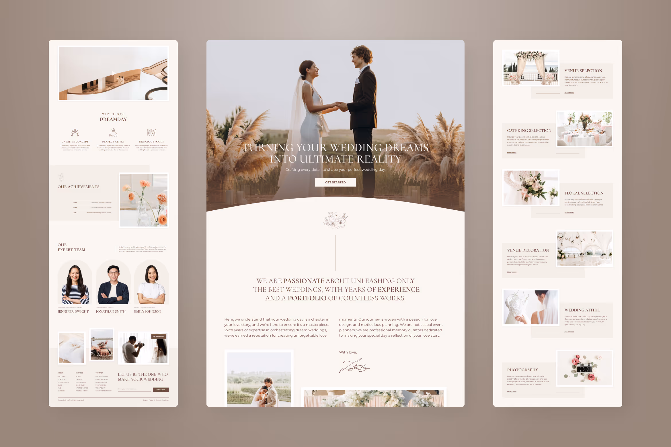 Offer your best services with the best website design for your prospective clients using DreamDay, a clean and minimalist wedding planner website UI Figma template. Although it may look simple, it has a classy vibe with an elegant touch of beautiful and dreamy wedding. The combination of beige-brown color with the floral elements strengthens a wedding atmosphere to every page. Use this template for your wedding planner or organizer website and get a great increase in visitors.