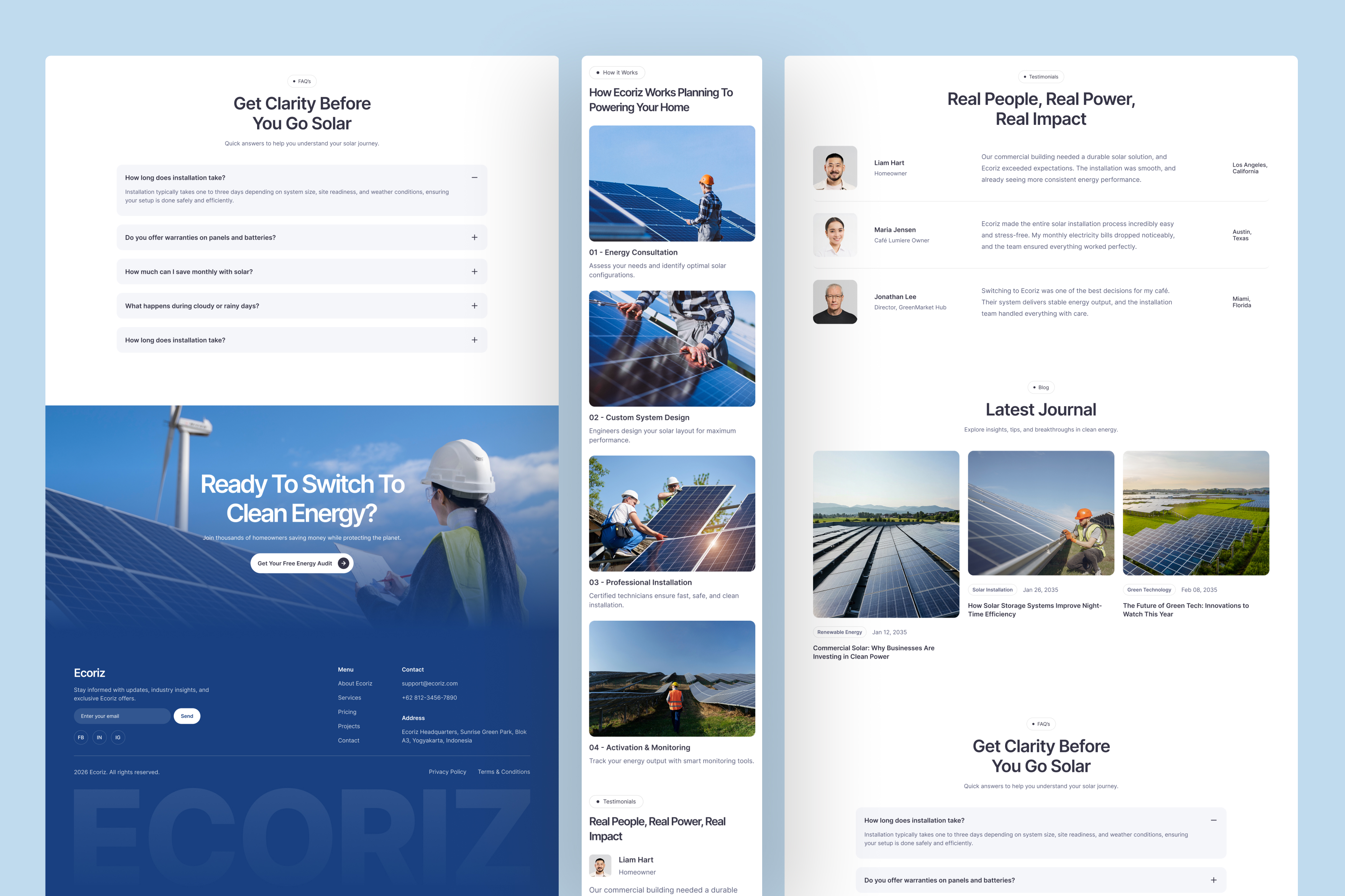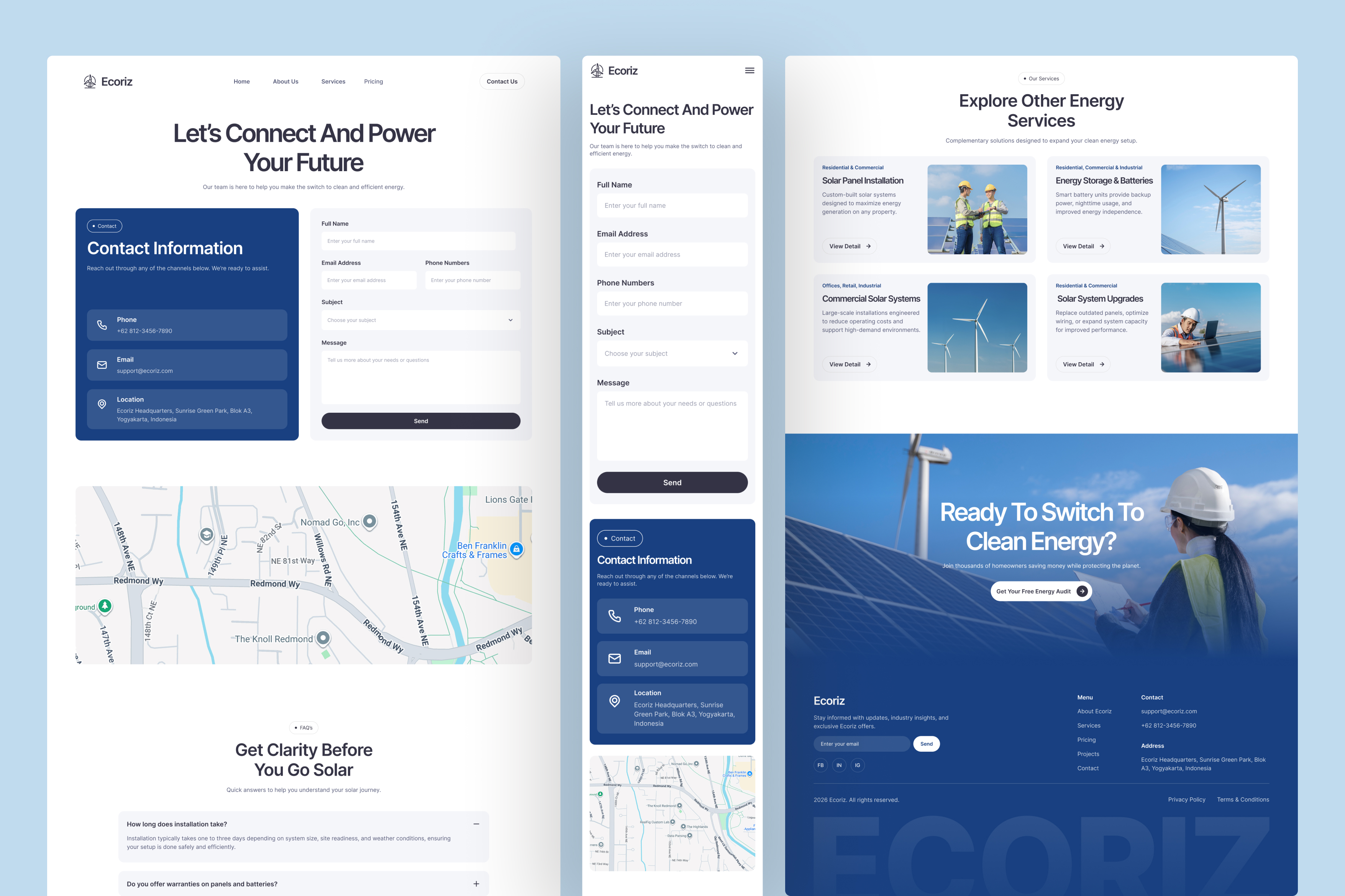 Renewable energy websites must communicate trust, environmental responsibility, and technical capability while remaining approachable for everyday users. Ecoriz is designed to support this balance by presenting solar and clean energy services in a structured yet friendly digital environment.