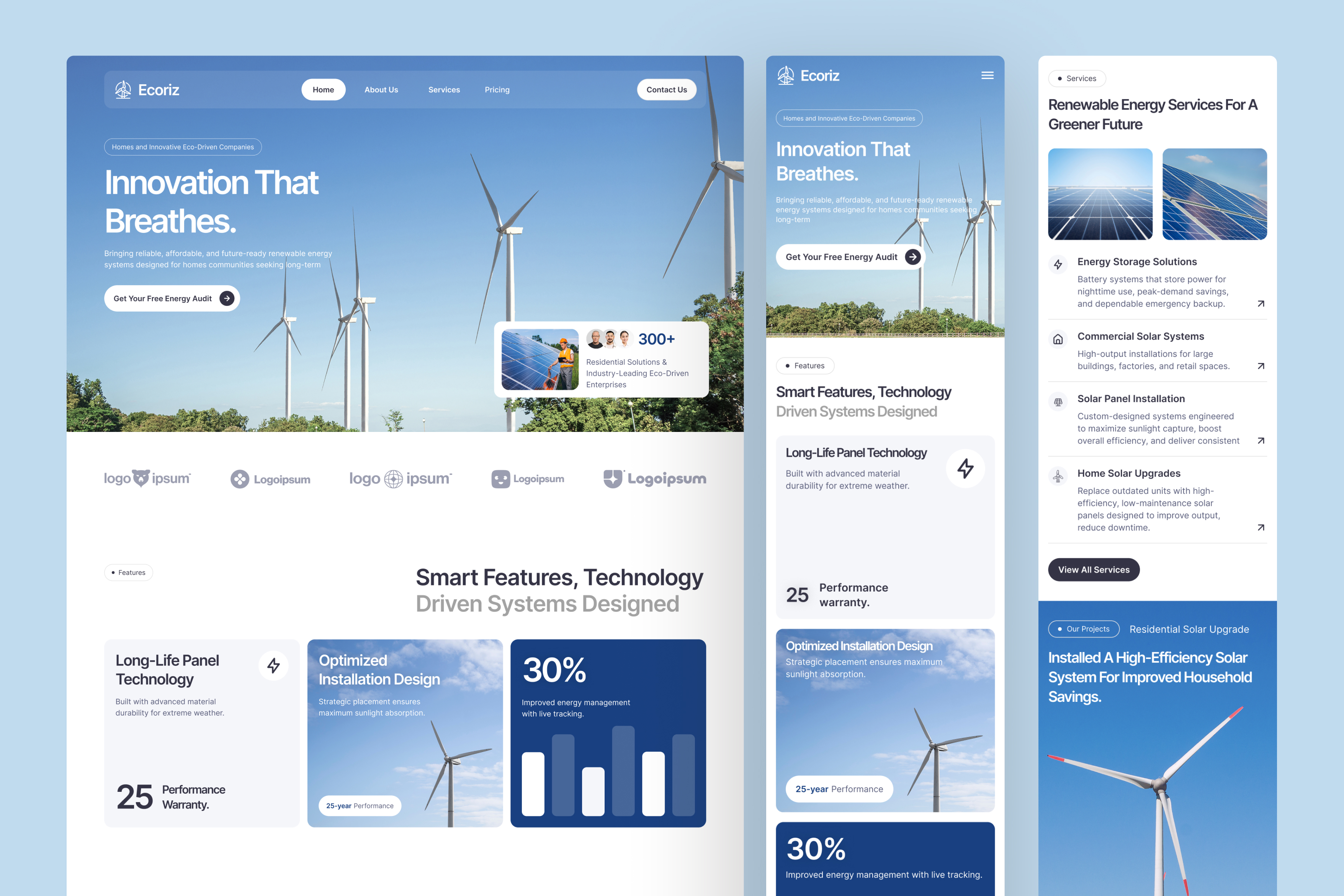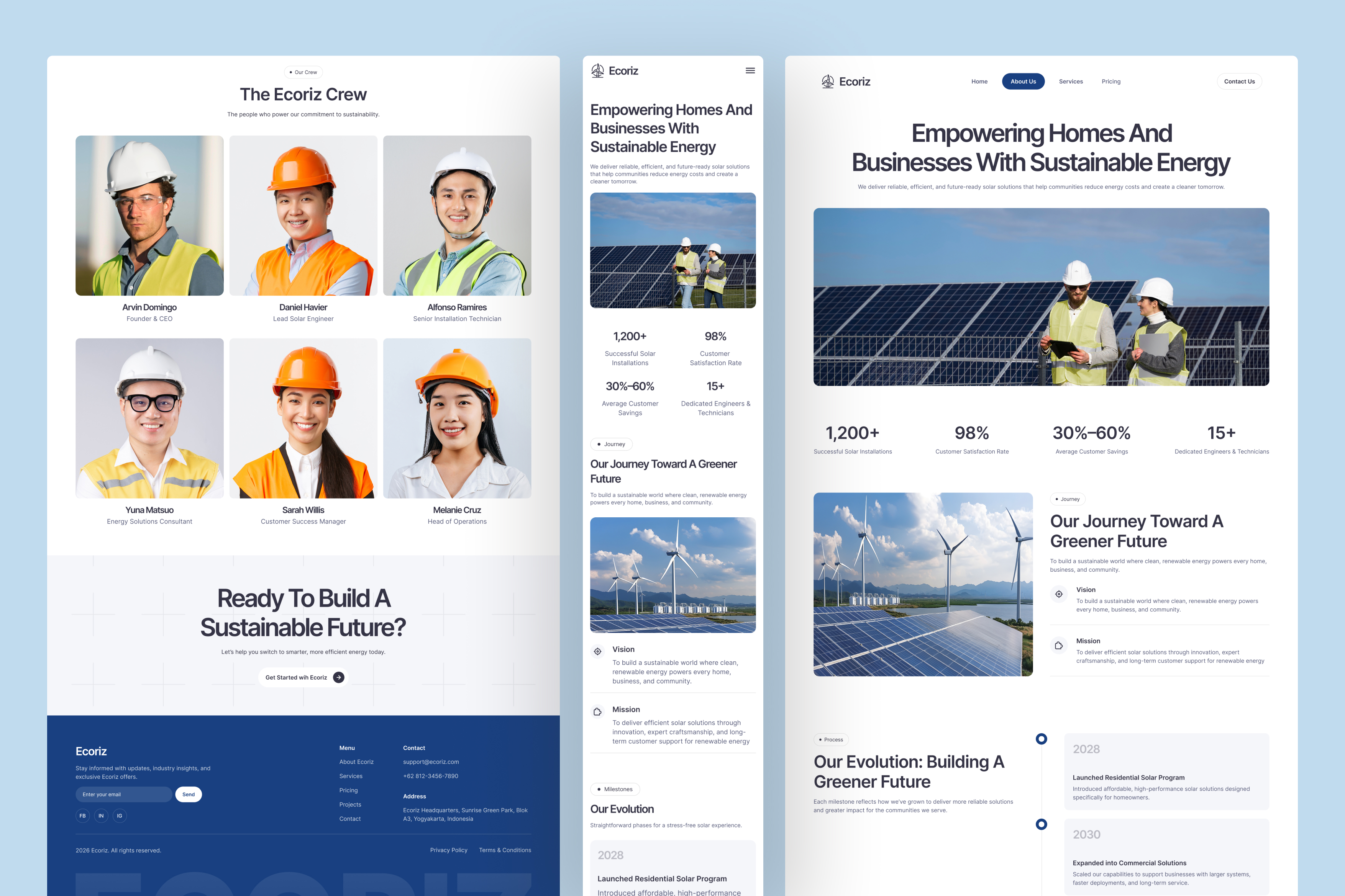Ecoriz uses a modern clean-energy design language that communicates innovation, sustainability, and trust: