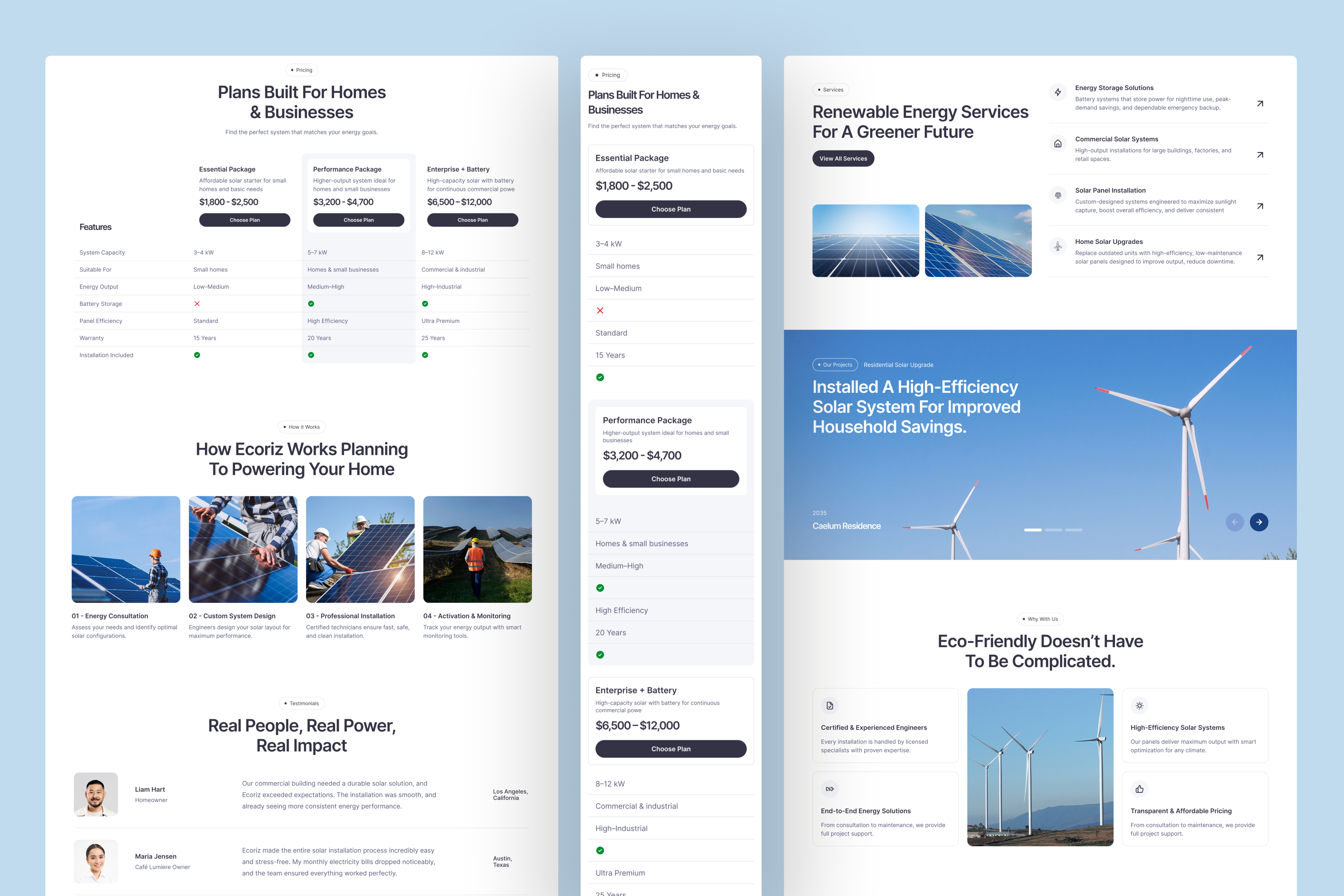 The layout emphasizes clarity through well-organized service sections, installation process steps, and educational content blocks that help visitors understand how renewable systems work. Supporting elements such as testimonials, service explanations, and pricing plans strengthen credibility while guiding users toward consultation or installation inquiries.