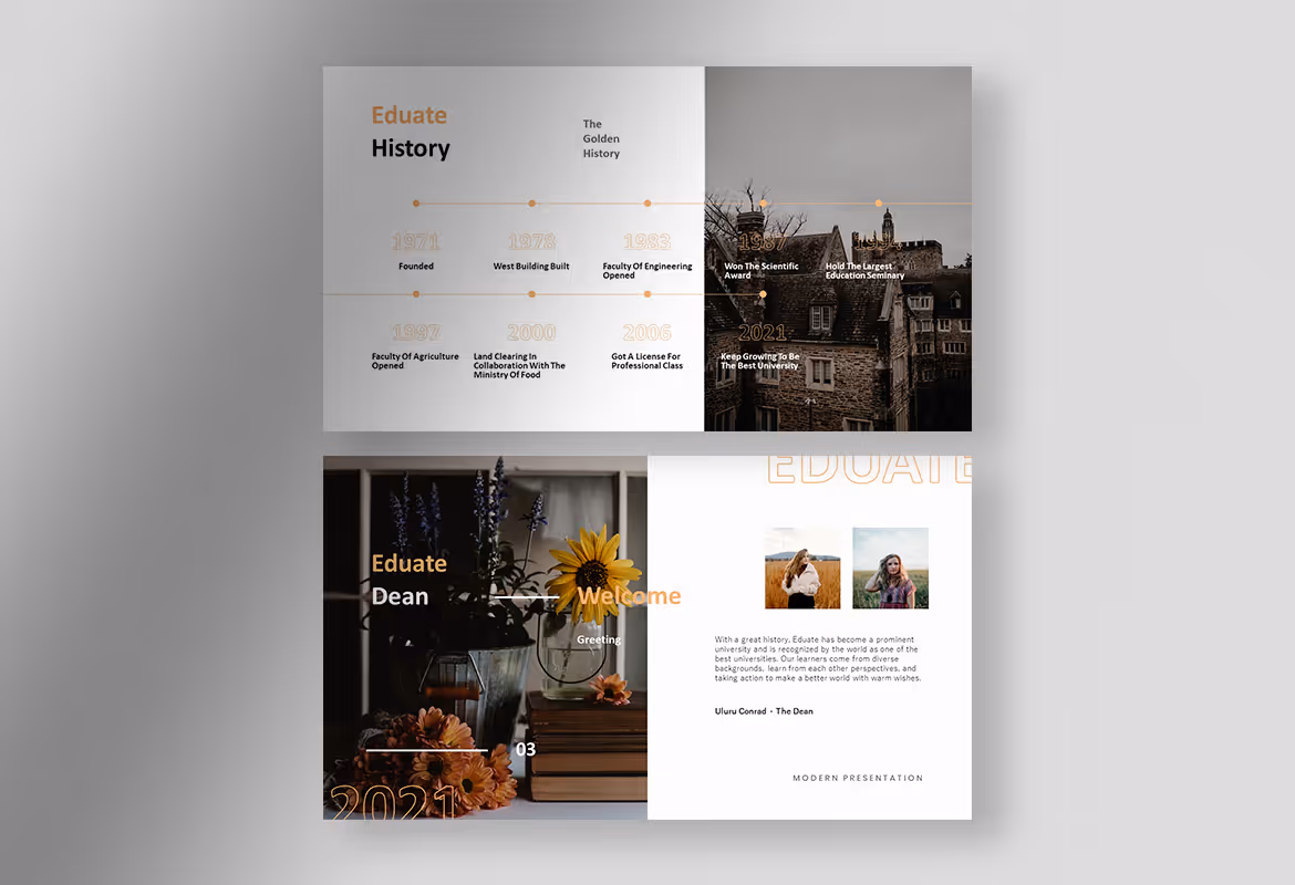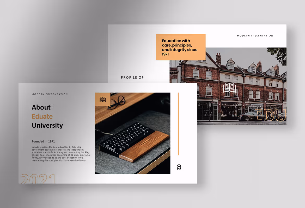 It has a well-organized layout and proportional composition. You can add some short history, facilities, teachers and programs of your university in these eye-catching and outstanding slides. Amuse your audience by using Eduate.
