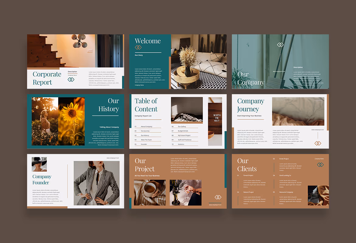 It uses a combination of turquoise, light brown, and white to deliver an elegant feel in every slide you make. The proportional composition and layout in the template will make your presentation to your prospective clients or partner more outstanding and eye-catching.