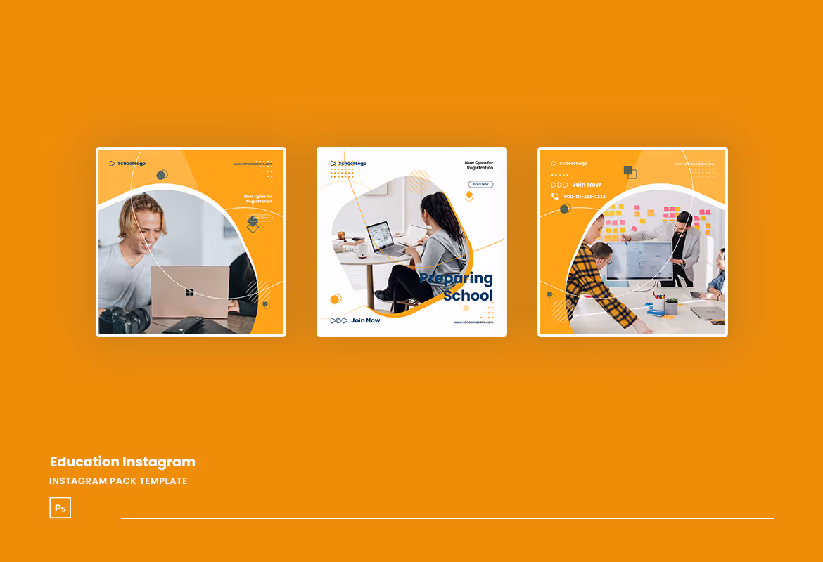 Elegant Education Instagram post template with a modern theme. This template is ideal for School, Campus, College, and any education theme. Make your Instagram promotion looks stunning and eye-catching using this template. This template includes 9 unique and cool post designs in PSD format. You can edit and customize easily using Adobe Photoshop.