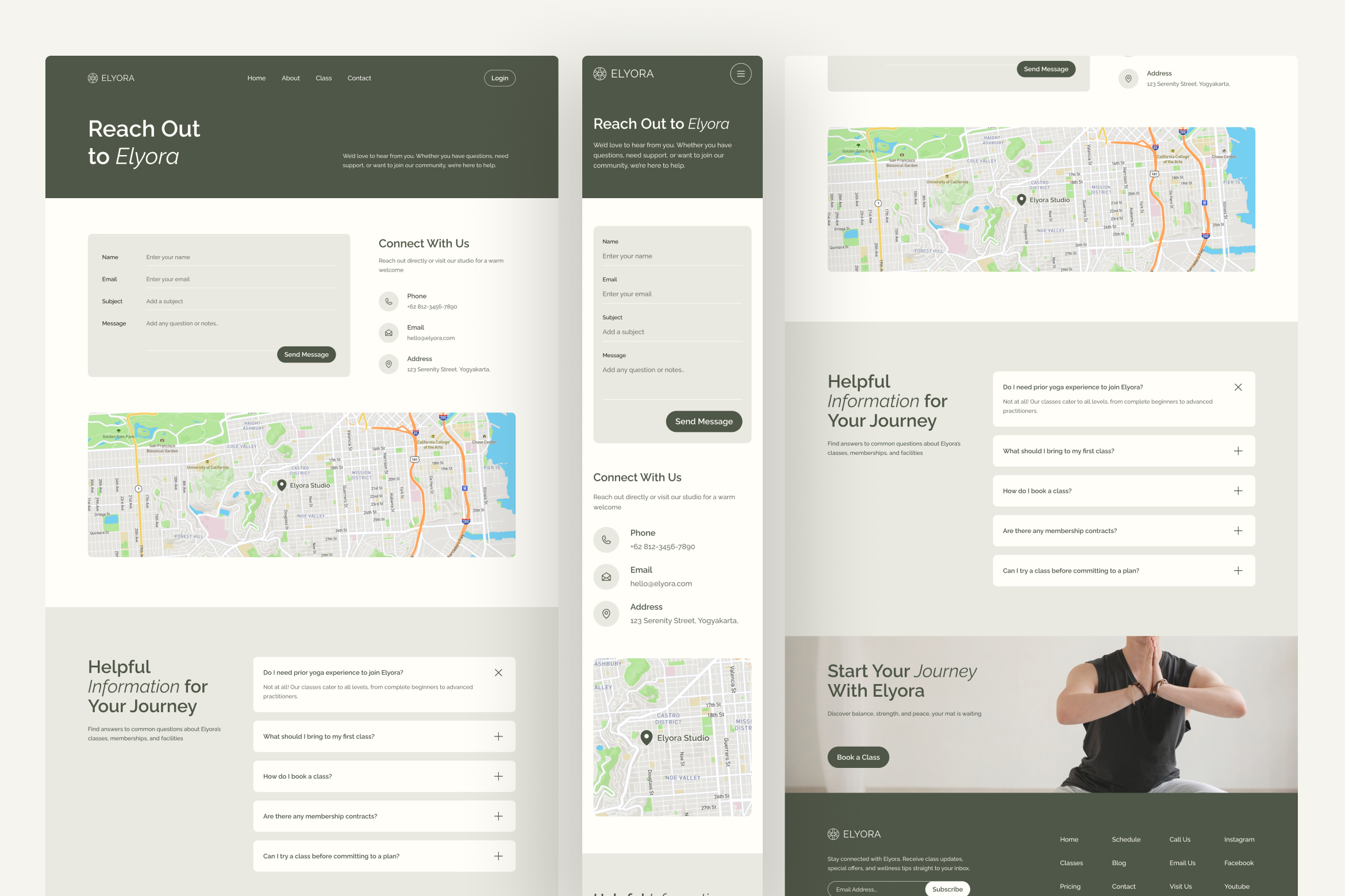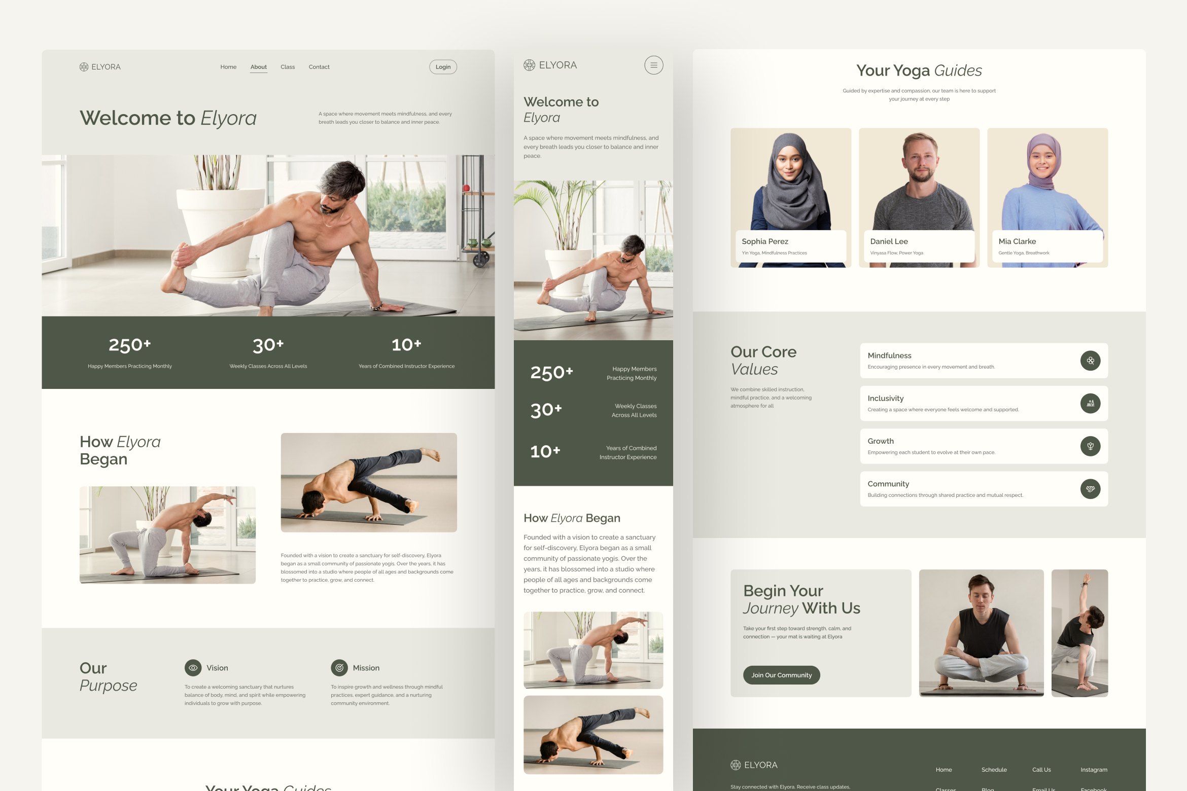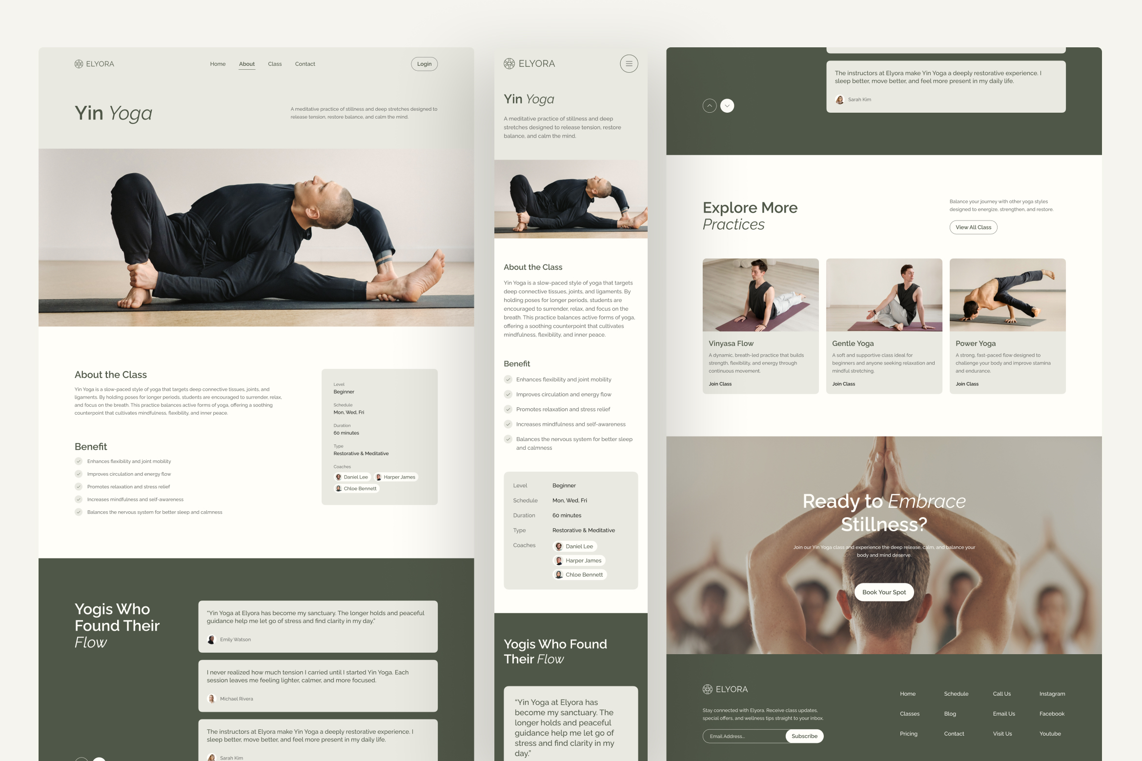 Find calm, clarity, and connection with Elyora, a modern yoga studio website UI template thoughtfully crafted to support studios, wellness instructors, and mindfulness practitioners. This Figma template comes with five clean and well-structured pages: homepage, about, classes, class details, and contact. It is designed for both desktop and mobile views, making it responsive and ready to support your yoga studio's online presence across all devices.