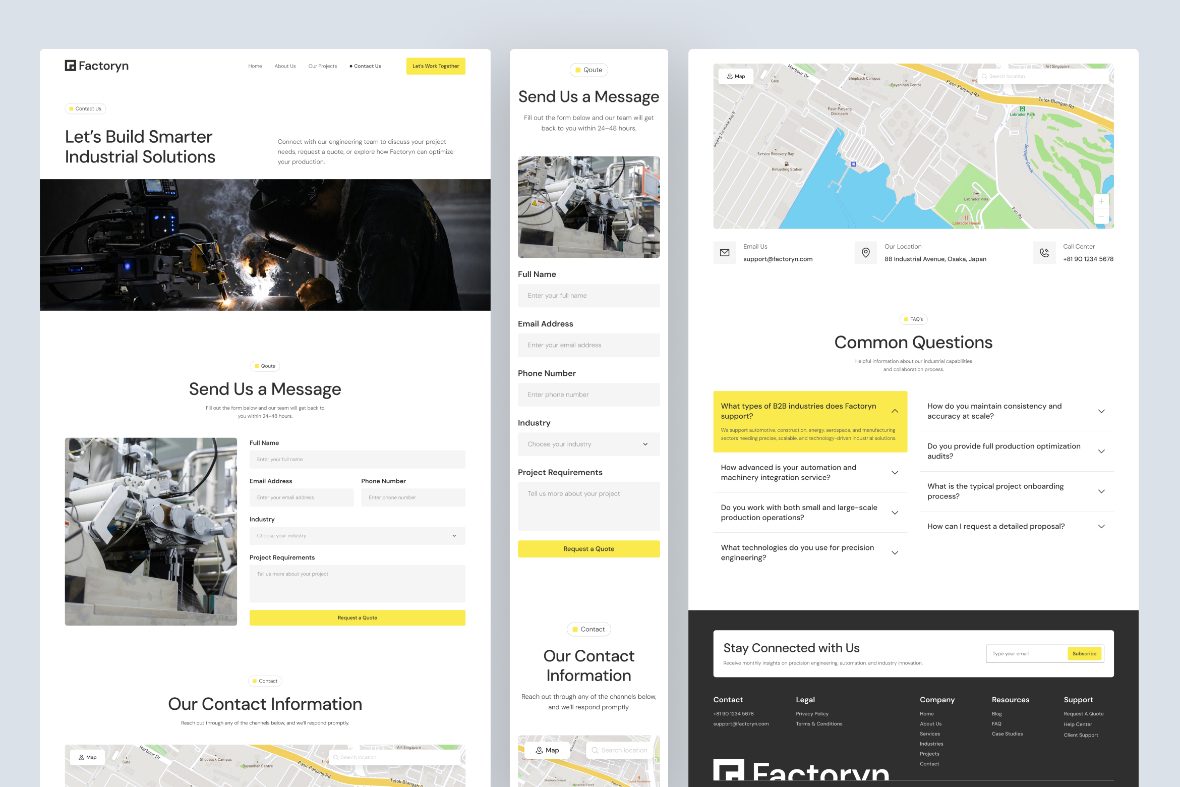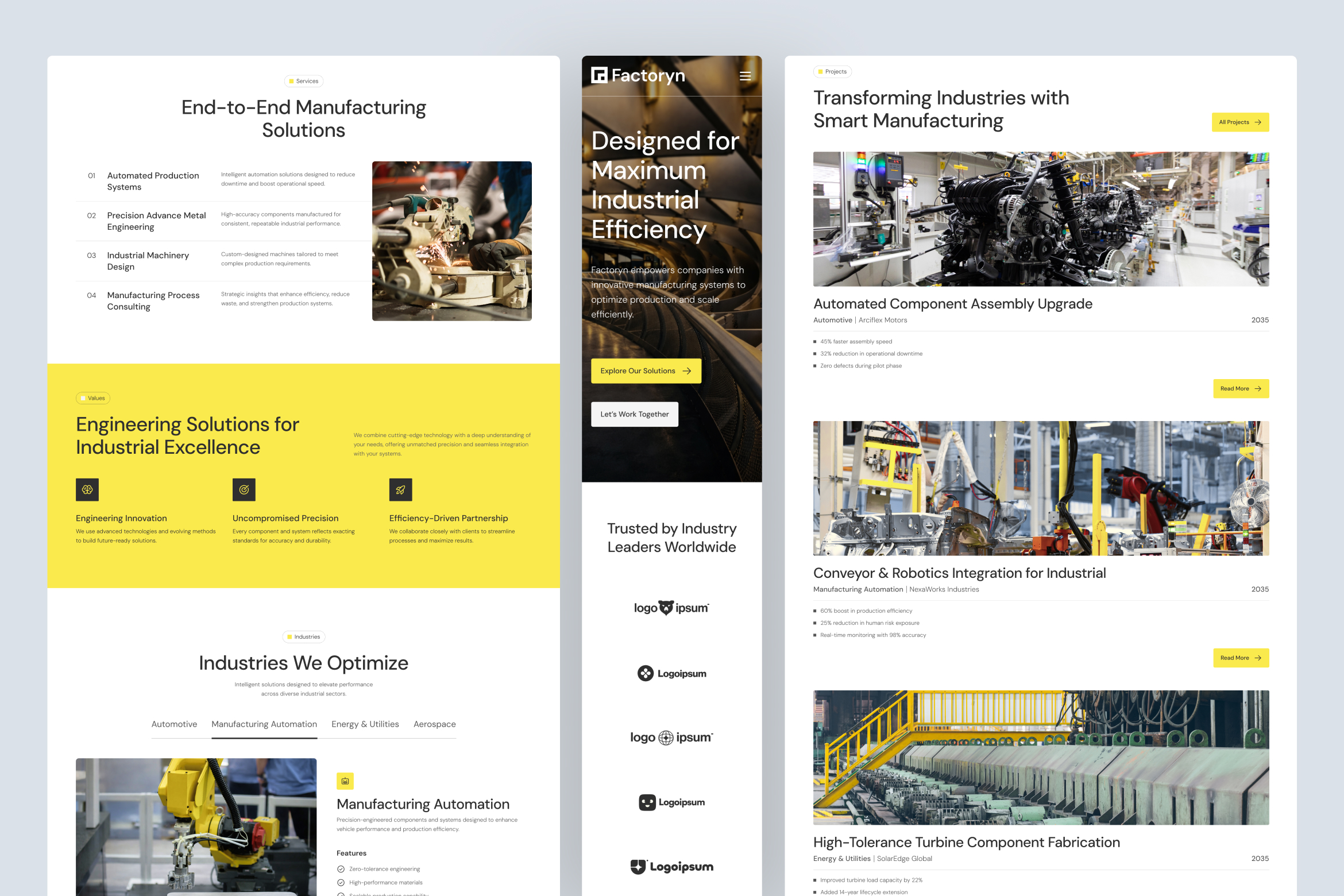 This website template is carefully structured to match common needs across industry and manufacturing sectors. Each page is designed to guide users logically through discovery, evaluation, and action. Supported by a consistent design system, strong typography hierarchy, and reusable Figma components, Factoryn is well-suited for production-ready designs, UI & UX explorations, and smooth Framer or Webflow handoff.