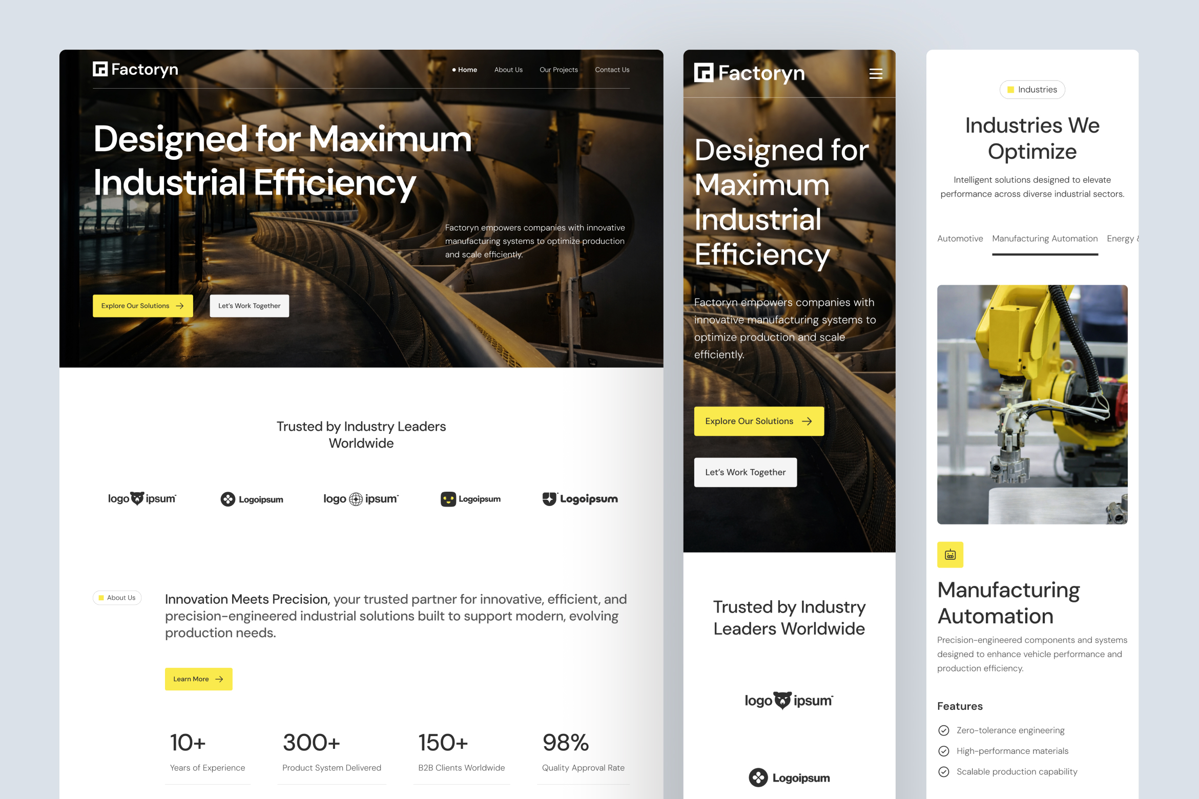 Establish a confident, results-focused industrial presence with Factoryn, an Industry & Manufactory Website UI Figma Template built for engineering firms, manufacturing companies, and industrial solution providers that prioritize clarity, precision, and performance. Built with a modern industrial aesthetic and a structured storytelling approach, it helps businesses communicate expertise, scale, and operational impact through a confident, professional digital experience. Available in both desktop and mobile views, the template ensures visual consistency, readability, and usability across devices.