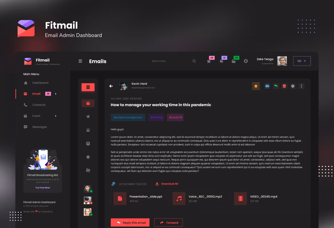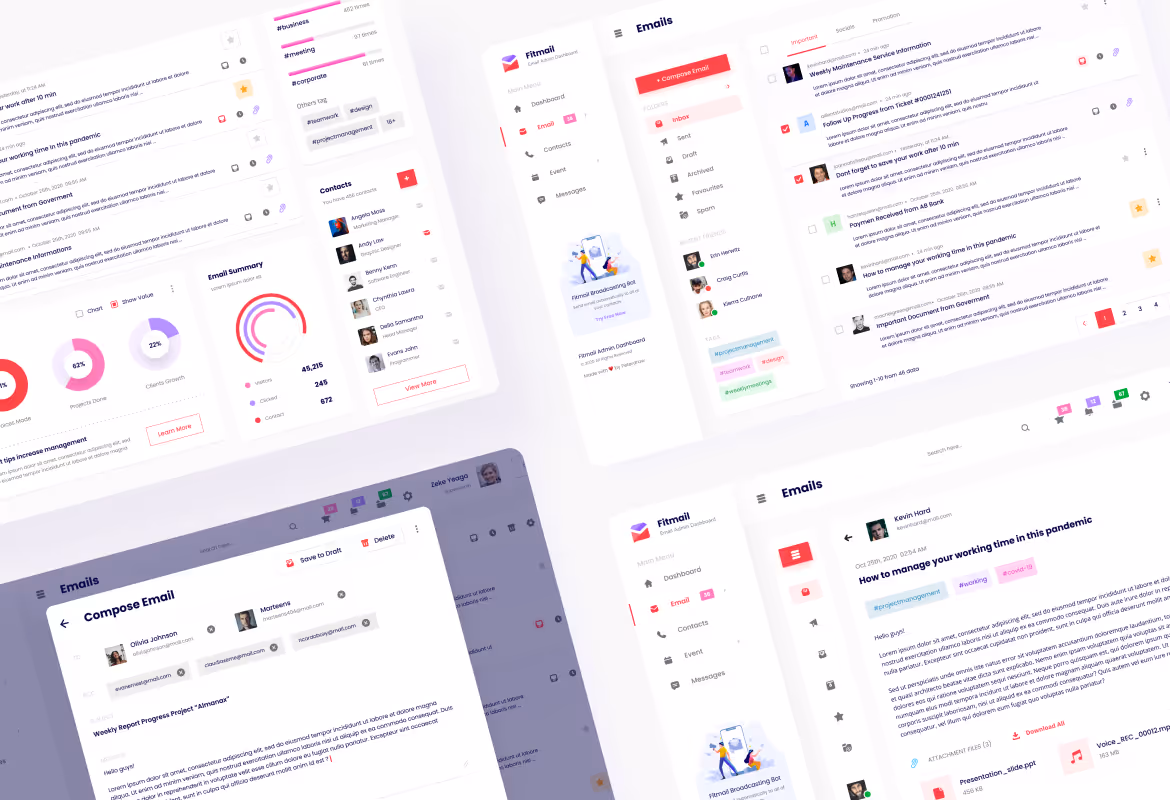 Modern dashboard User Interface design template for an Email Manager. This template is ideal for email app, contact app, and any admin dashboard website.