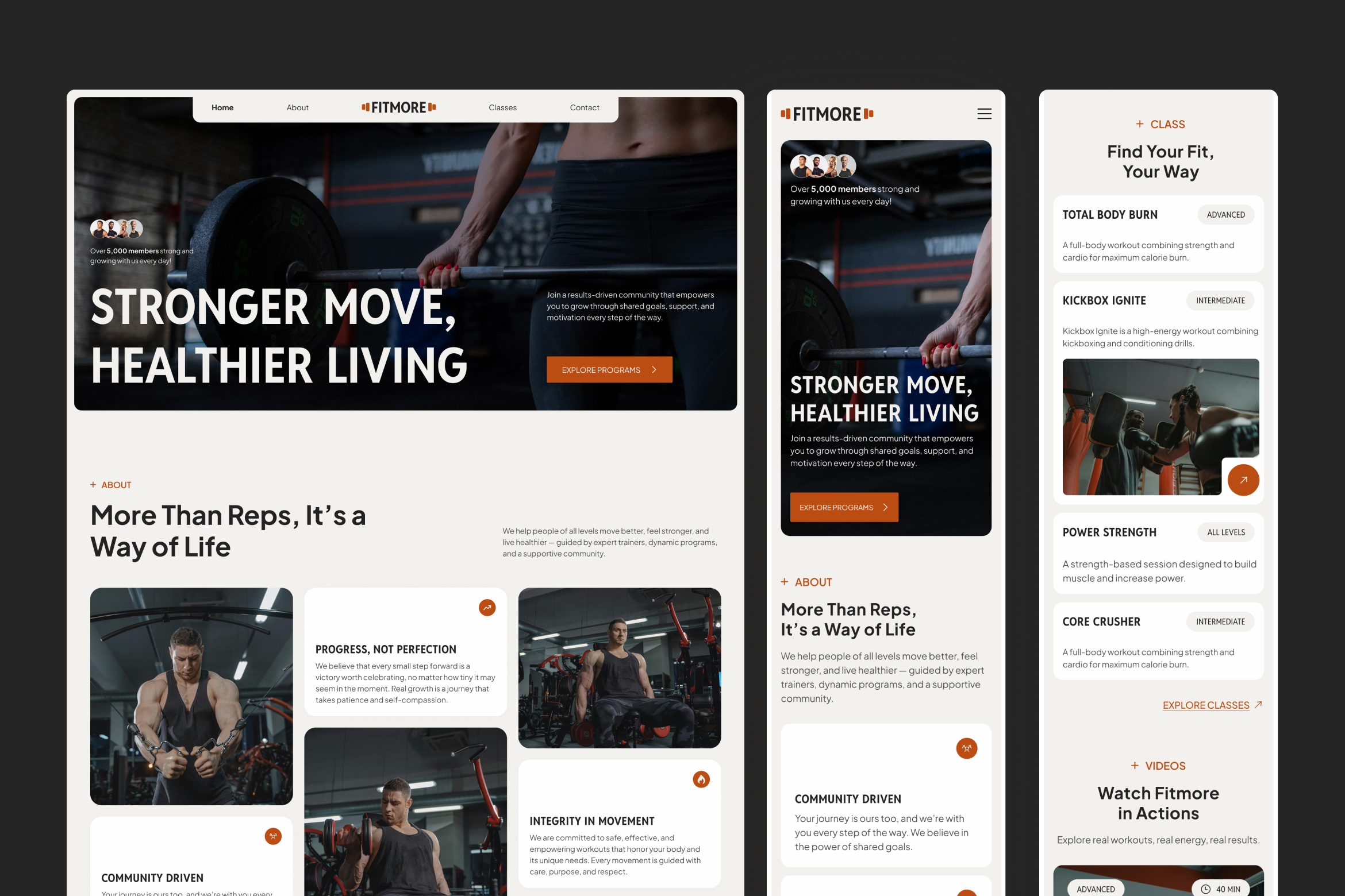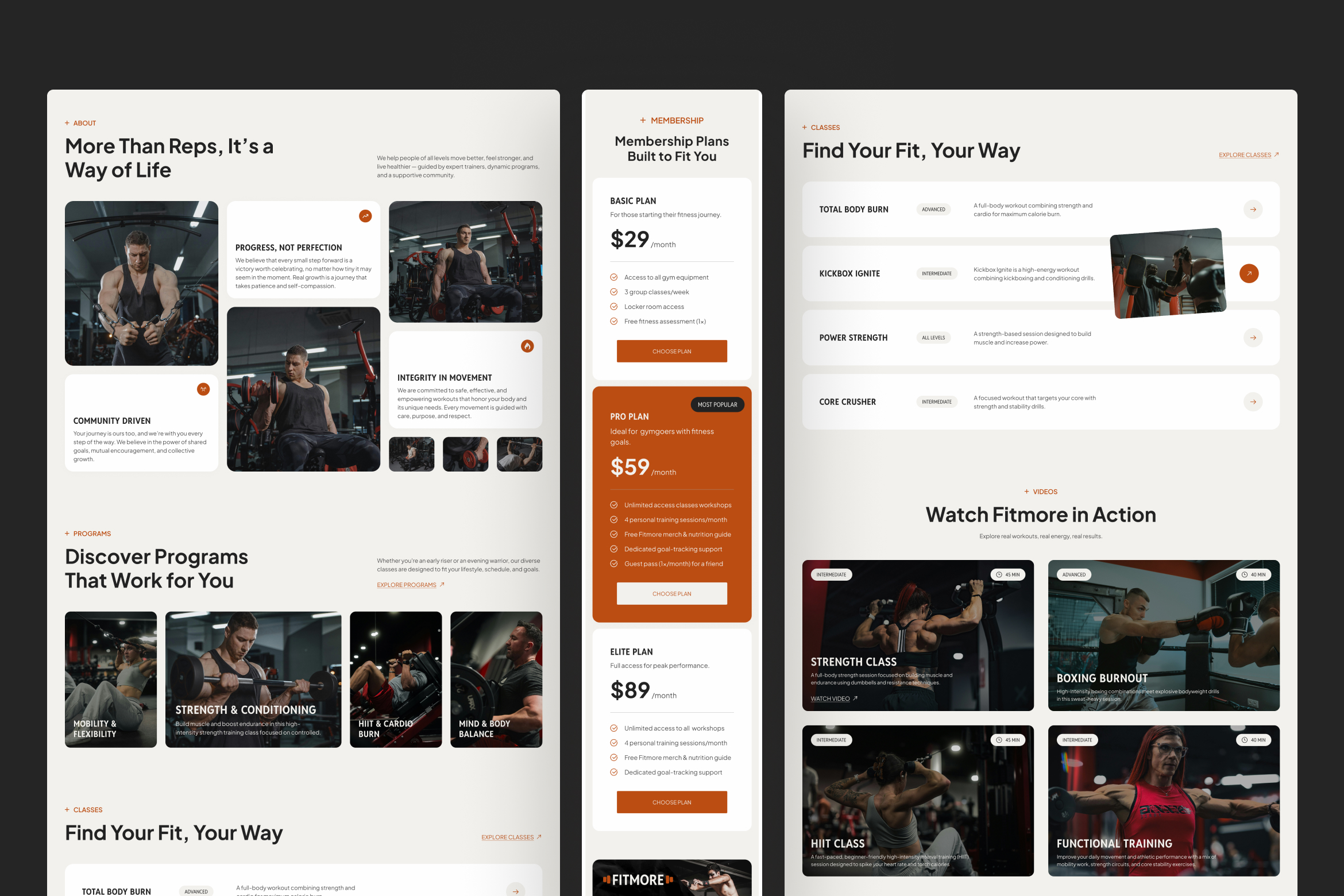FitMore uses a modern fitness website system with bold imagery, warm accents, and clean content sections that keep the experience energetic but still readable and organized: