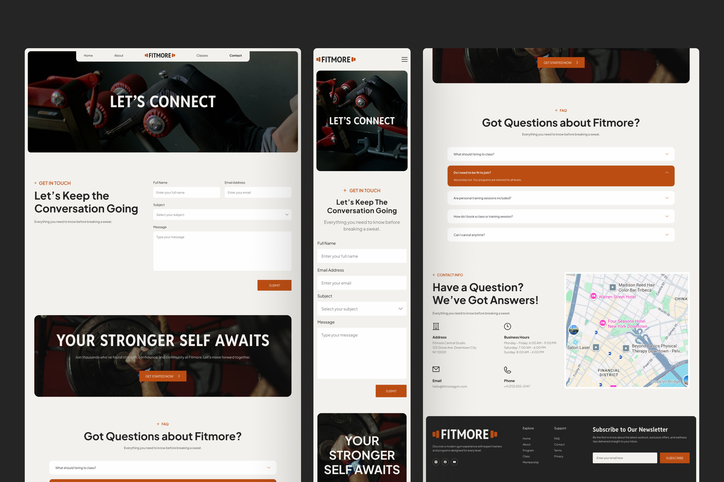 FitMore is also ideal for UI & UX design exploration. The layout uses consistent spacing, strong hierarchy, and reusable content blocks that make customization fast. It works well for designers building a client-ready gym concept, a landing + program flow, or a portfolio case study that needs a strong visual direction.