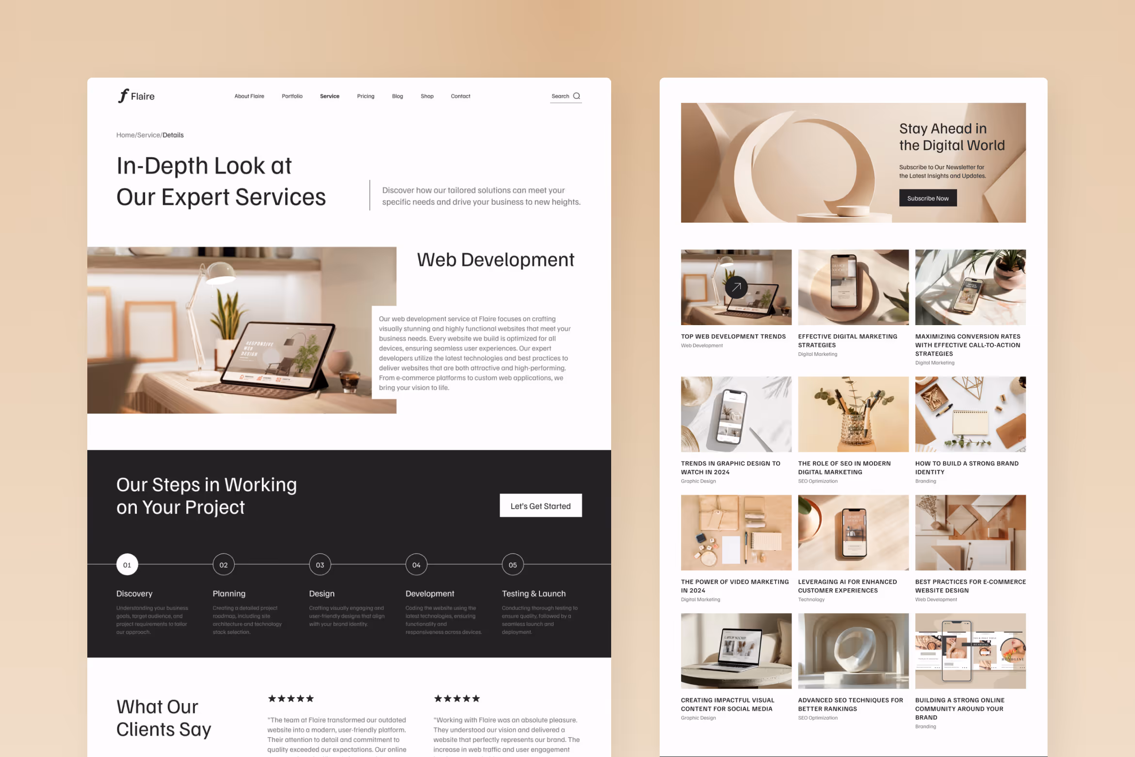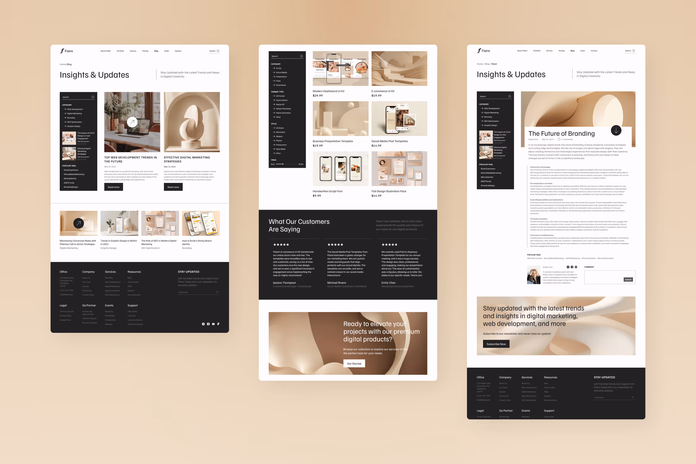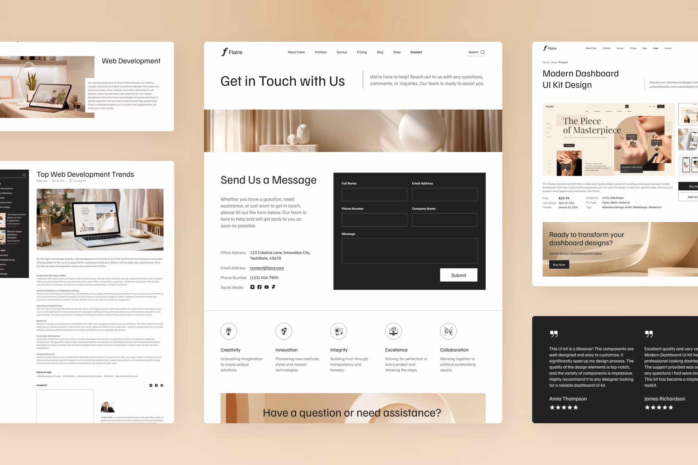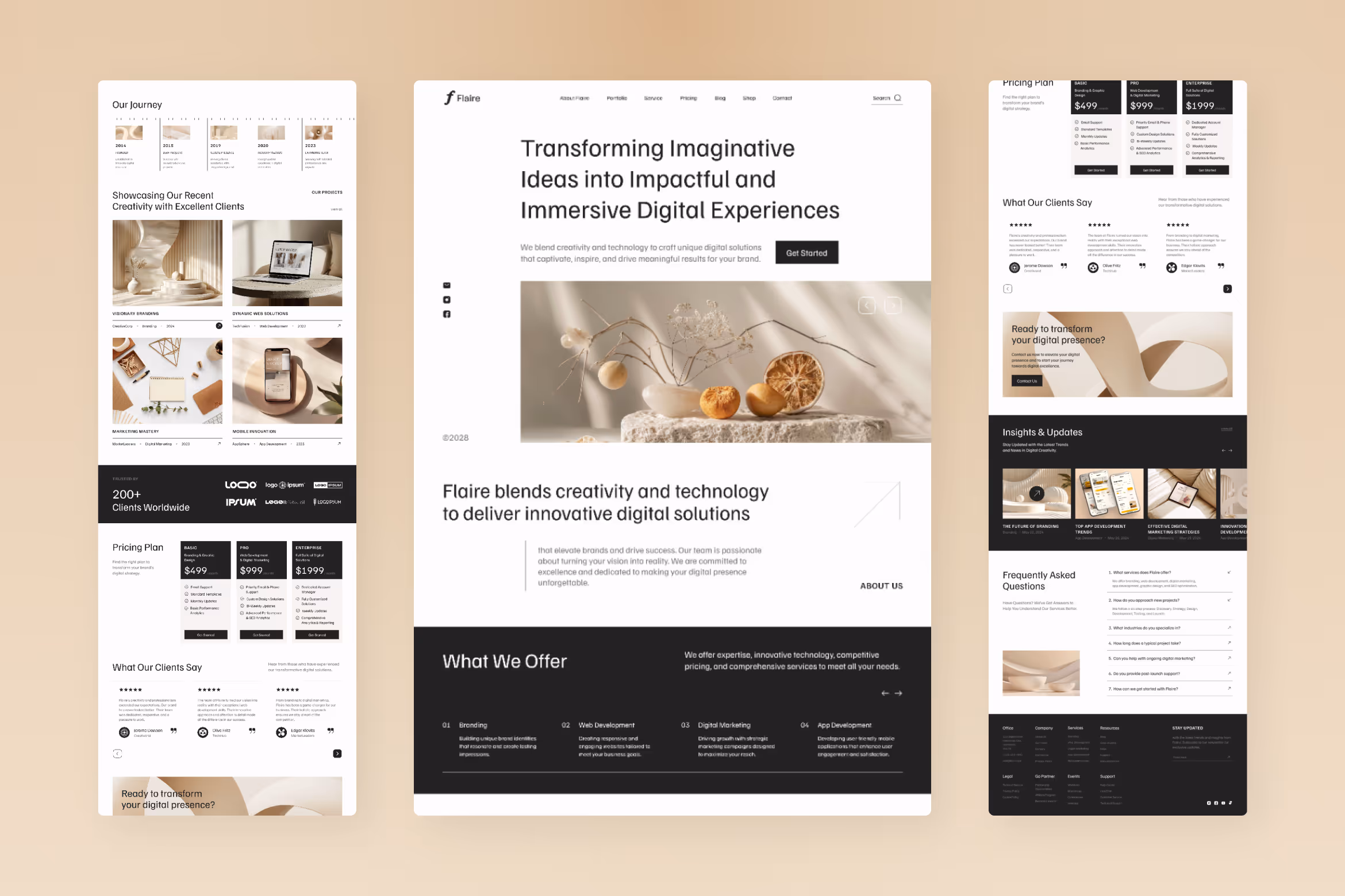 Provide a professional look for a more convincing creative agency website using Flaire v3, a minimalist creative digital agency website UI Figma template. Its simplicity makes every section and page easy to explore. Users will find it comfortable to review everything you provide on the website. The basic color combination of black and white makes this template outstanding and keeps the professional vibe. Get better performance and traffic for more clients on your website using this template.