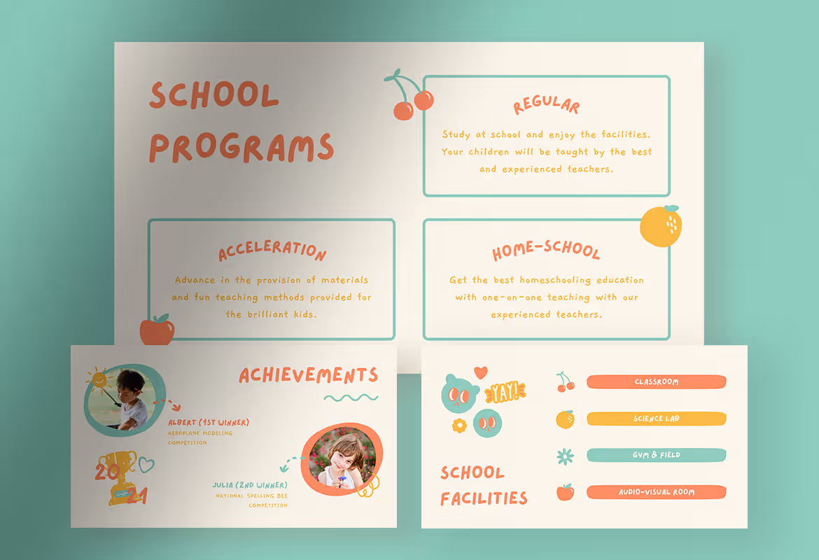 With a cheerful and eye-catching design, this template can provide the general information of the school, whether its programs, teachers, facilities, and school admission. Besides, you can also present the achievement obtained by the students, during in class or other activities supported by the school to motivate the kids and parents to join the school.