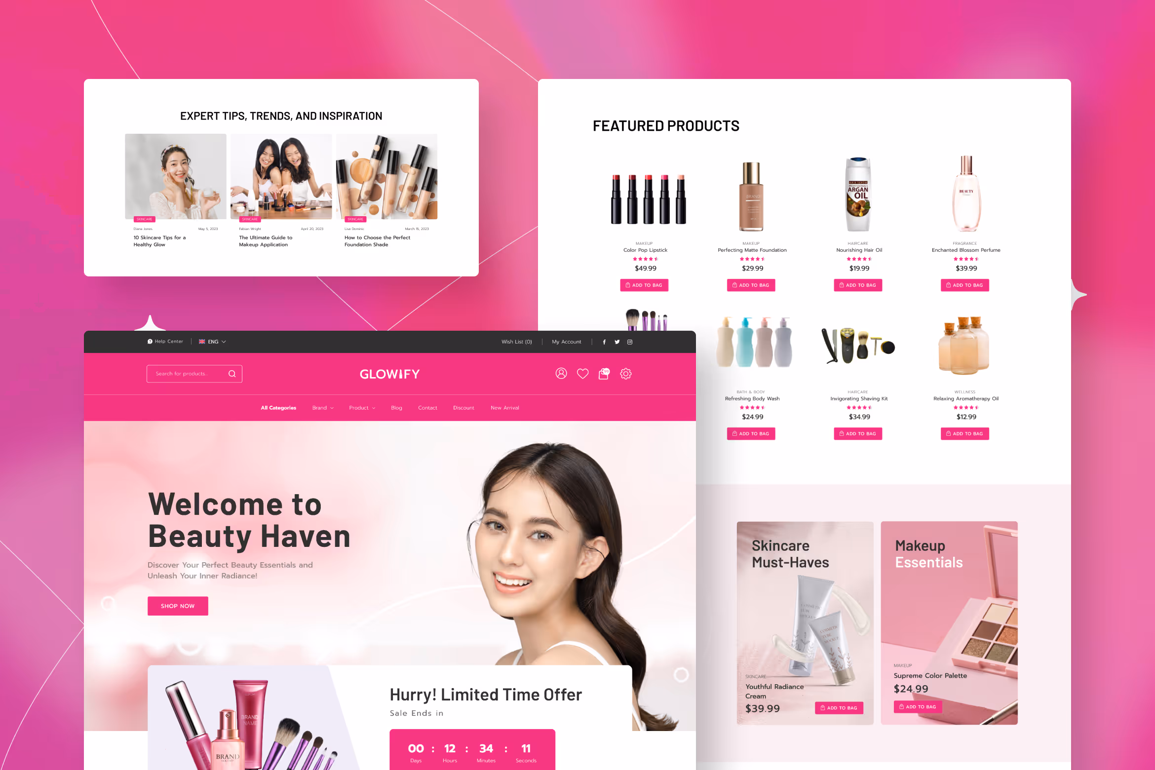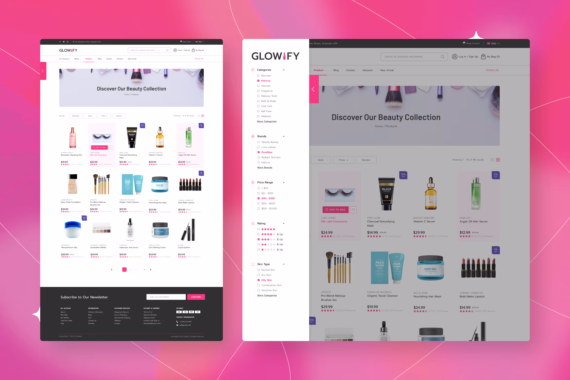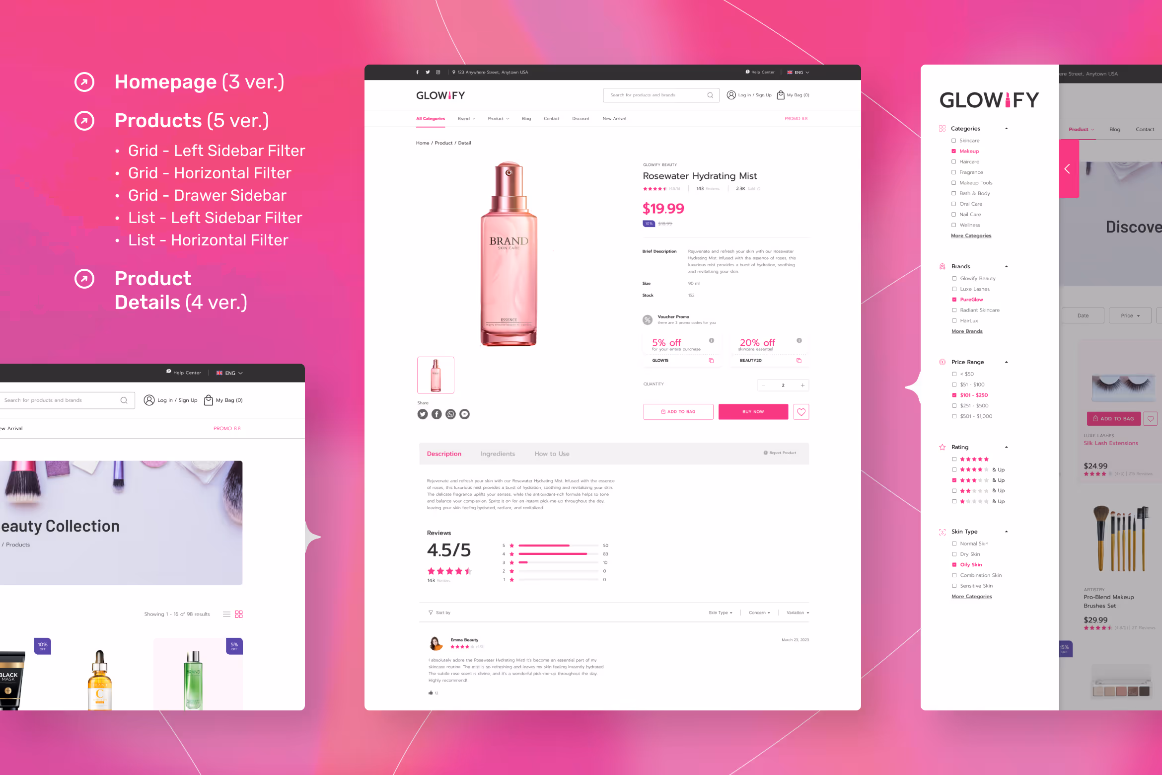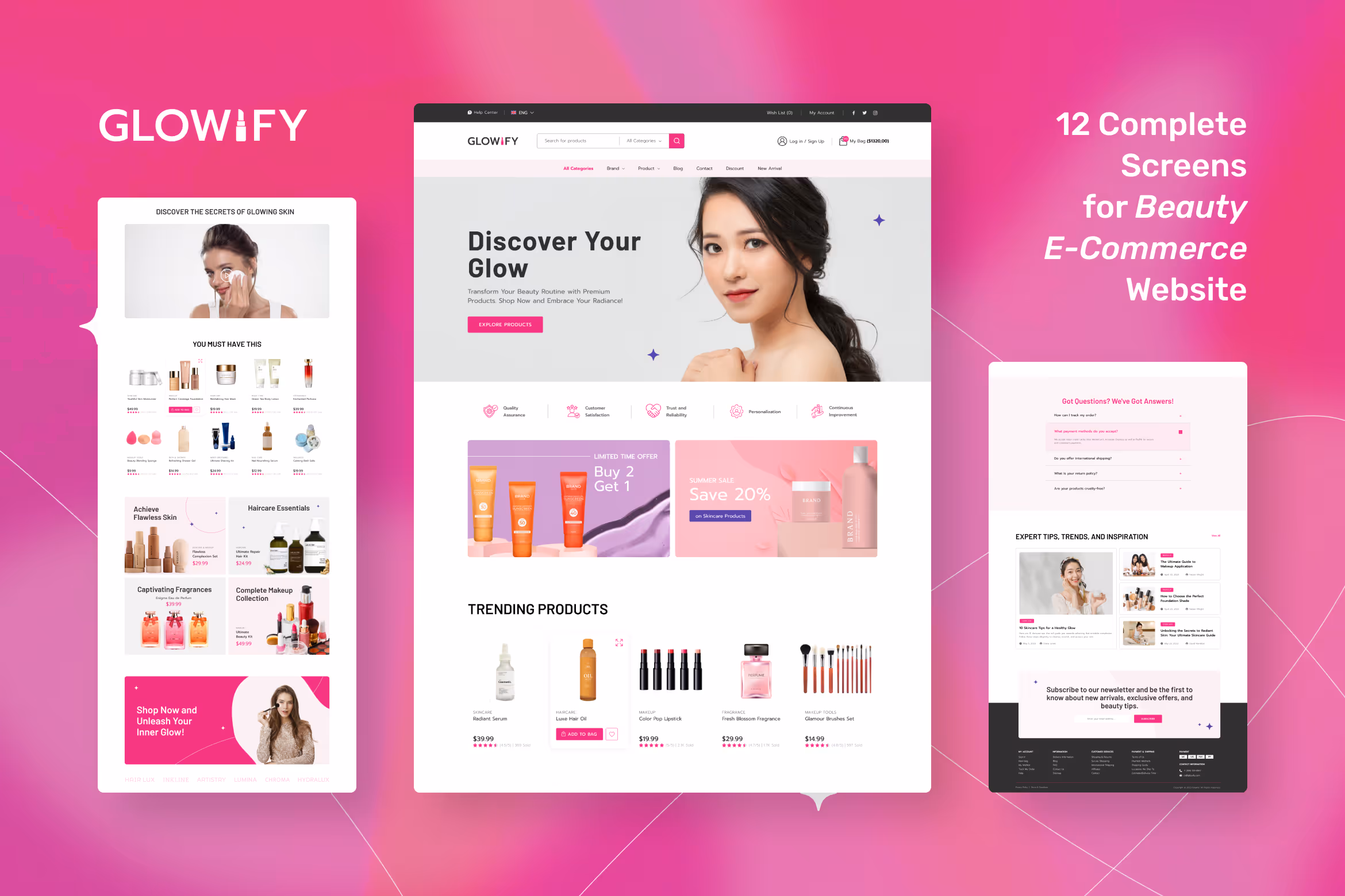 Get a new, refreshing face on your beauty e-commerce website using Glowify, a clean beauty e-commerce website UI figma template. It provides you with three different homepage designs you can apply as you like it. Its clean and neat appearance allows your website visitor to explore the website more easily. The touch of blush pink makes this template more appealing and suitable for beauty, skincare, and makeup e-commerce. Invite more people to your website using this template.