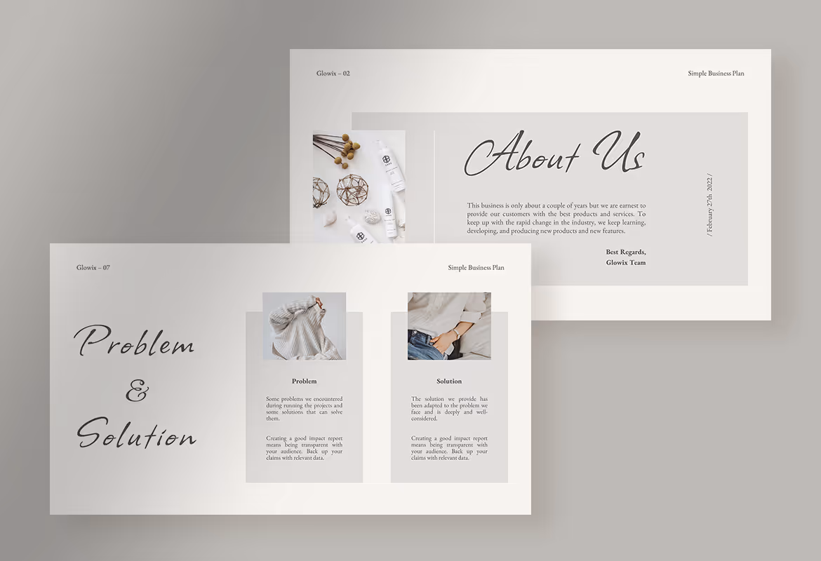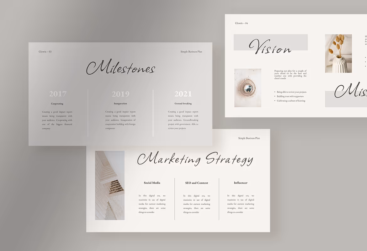 This template has a simple design with a monotone color palette that makes it look soft and elegant. This simplicity makes the template more eye-catching that can capture the attention of your audience. In this well-organized layout, you can put your mission and vision, project overview, portfolio, a marketing strategy. The information you share will help you to increase the trust of your clients and customers. Make your business plan presentation to be more understandable and presentable using Glowix.