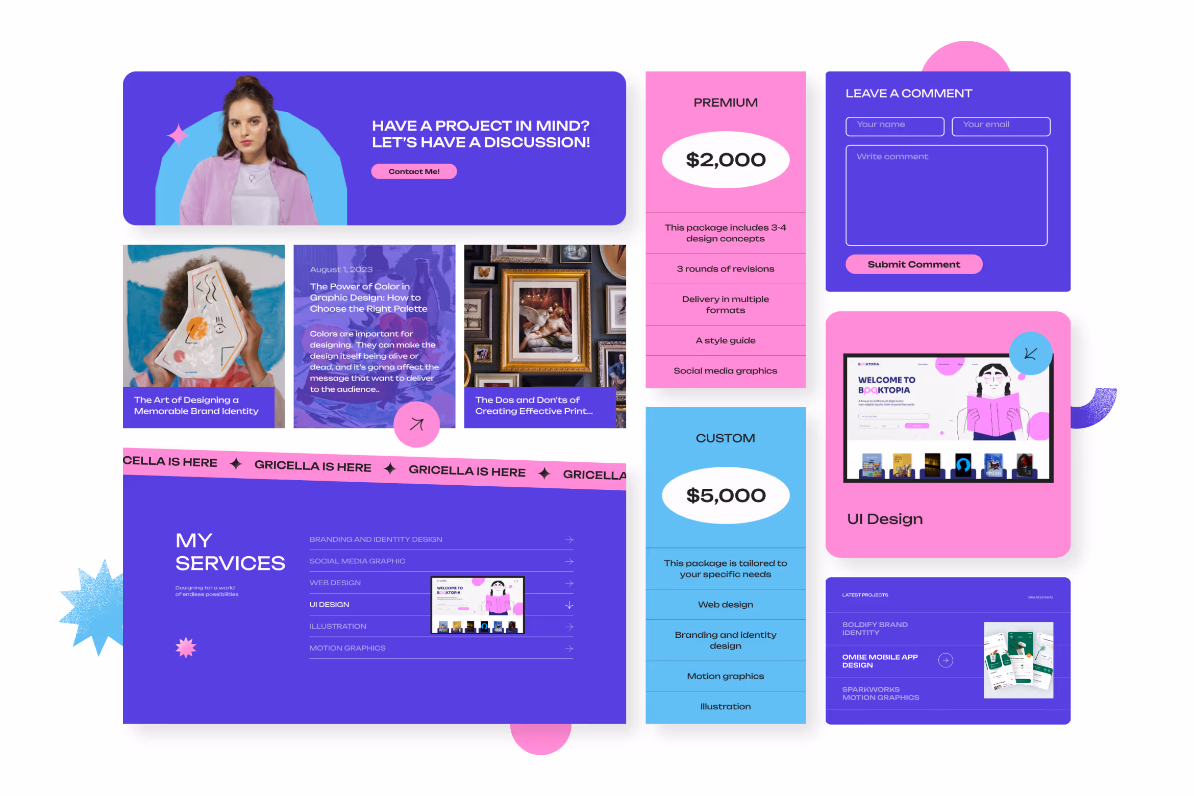 This template has a bright and cheerful color combination that makes it look more pop out and stand out. It hires sans serif fonts with bolder shapes and strokes, highlighting your bolder personality. Besides, there are many basic y2k elements that make the design more stylish. Other than that, the layout is organized neatly which please the eyes of everyone who sees it. You can use this template to set your homepage, about, services, project, pricing plan, blog, and other pages in an adorable way.