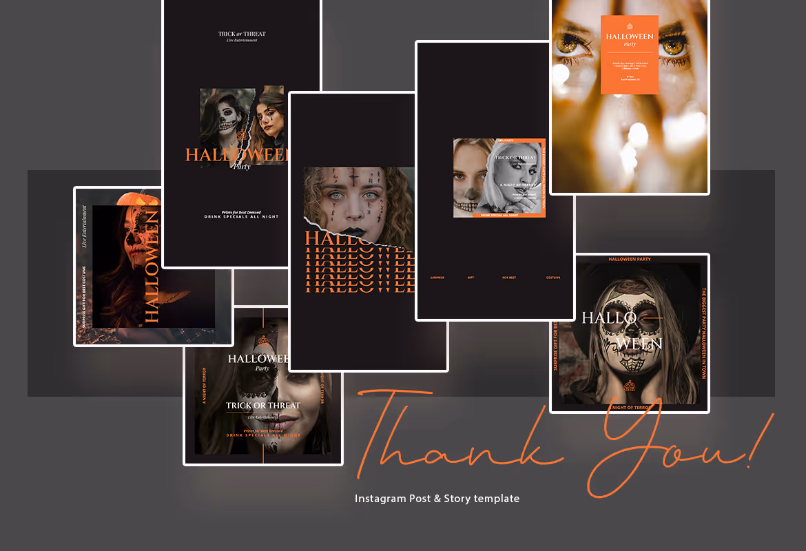 Halloween Instagram post & story template with a modern urban theme. This template is ideal for Halloween Party, Halloween Event, Trick or treat, Live entertainment, and more. Make your Instagram promotion looks stunning and eye-catching using this template. This template includes 12 unique and cool Instagram posts and Story templates in PSD and AI format. You can edit and customize easily using Adobe Photoshop and Adobe Illustrator.