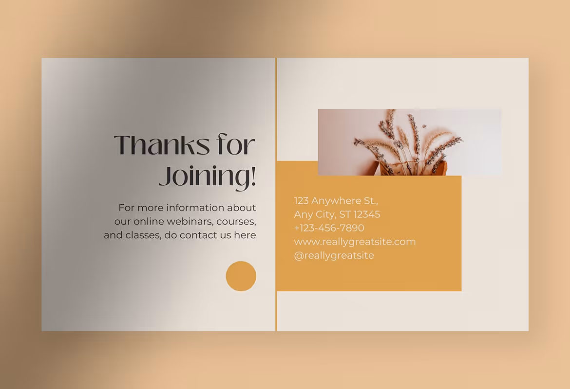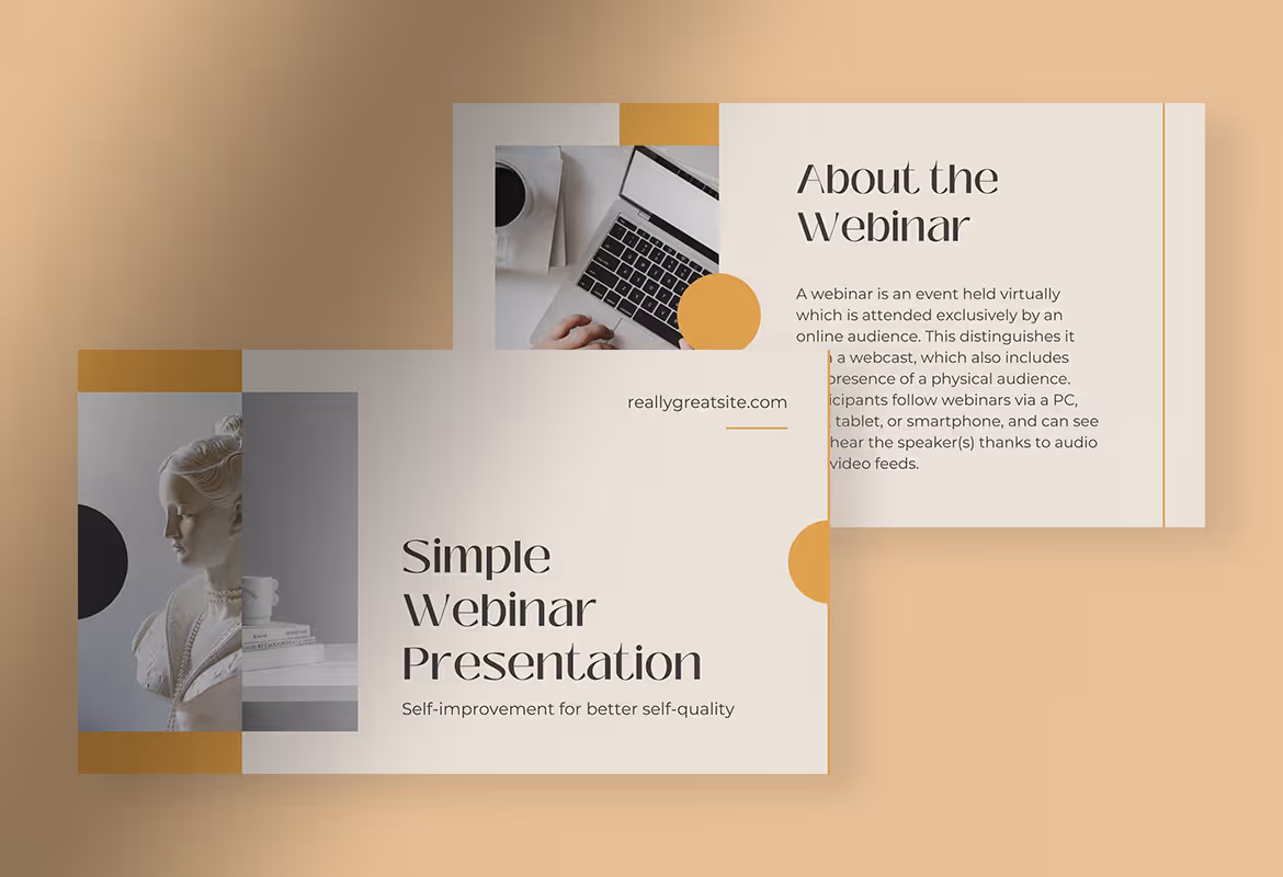 It has a spacious space with a well-organized layout to accommodate all the discussion material you have to deliver. Even though the design is simple, this template can make your presentation outstanding and eye-catching because it can give a neat and professional look. Having a clear division in every session can help you manage presentation time more effectively and efficiently. Make your webinar presentation always attractive to gain more participants and trust.