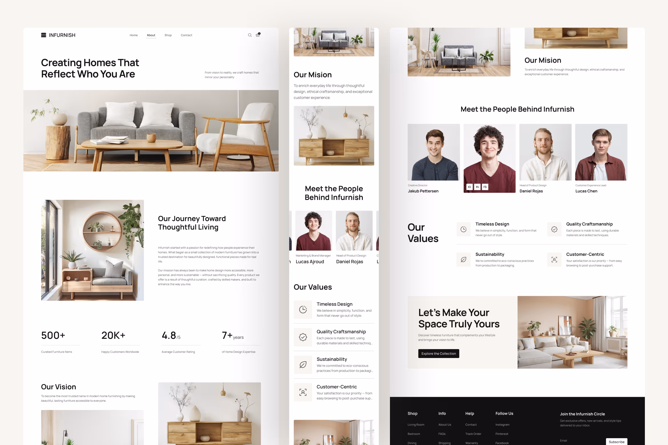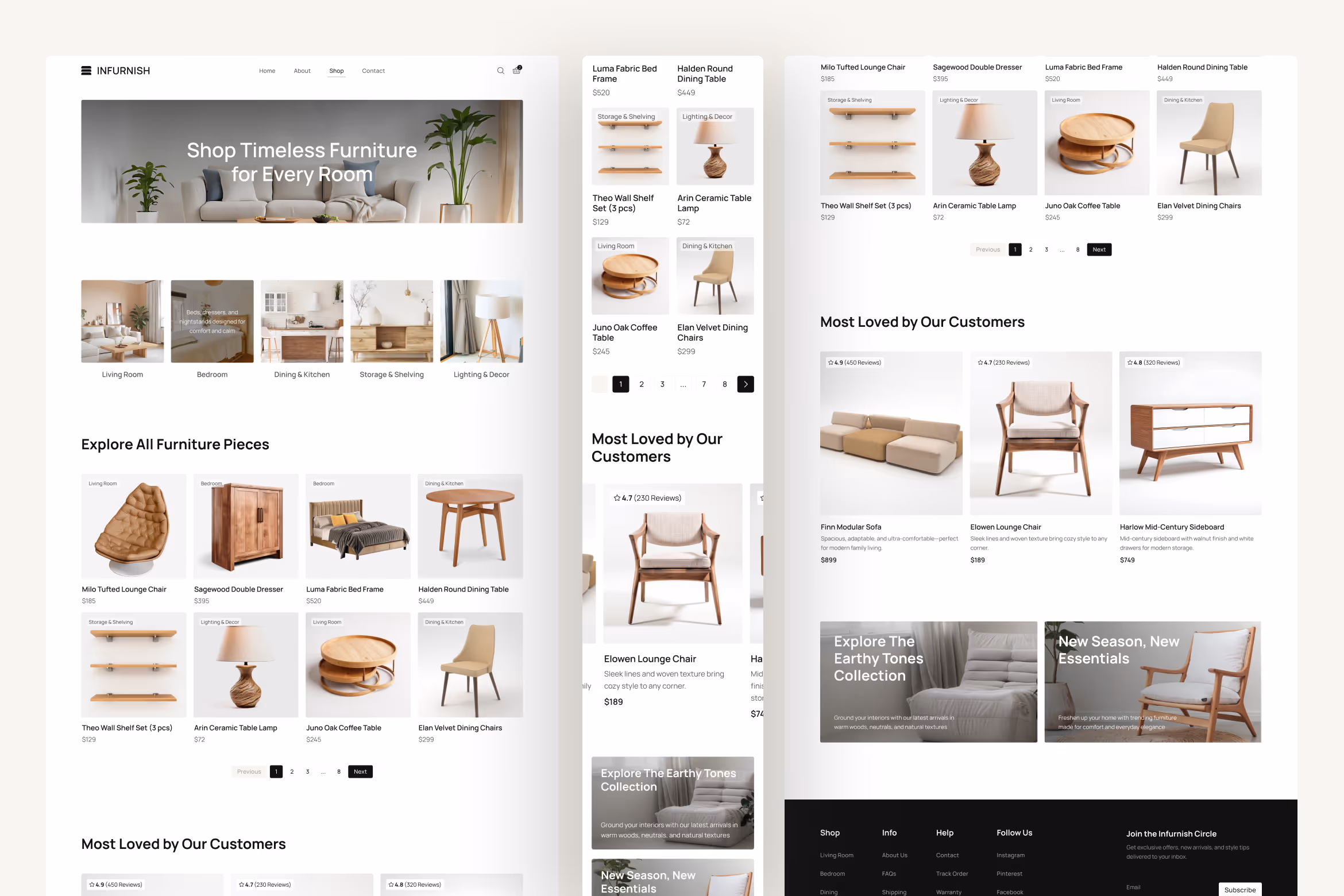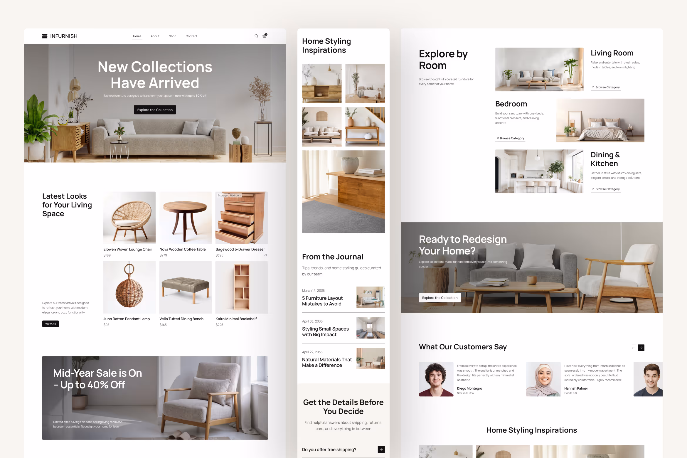 Infurnish balances visual harmony with user-focused navigation, blending soft aesthetics with commerce-ready structure.