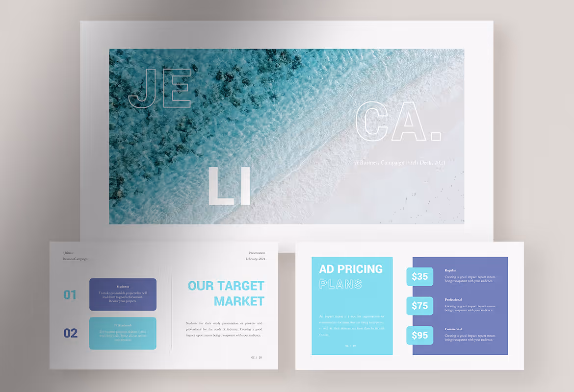 The aquatic and ocean theme in the template gives a fresh sight and vibe that will energize the team to run the presented campaign. The well-organized layout can accommodate all the campaign information you need to share. Create an amazing and eye-catching business campaign presentation with Jelica!