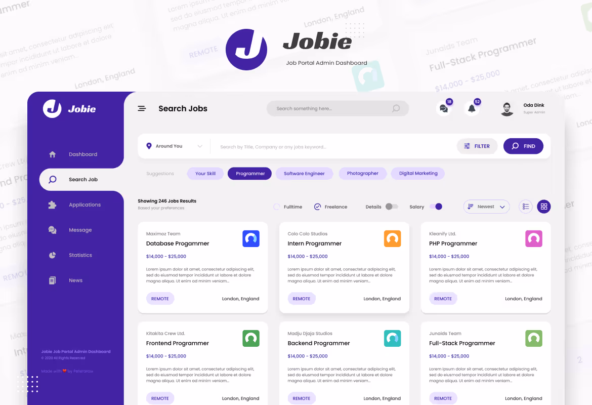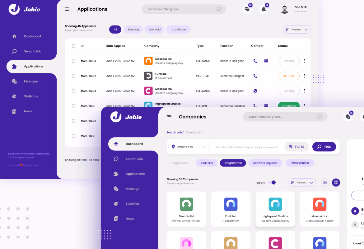 Modern dashboard User Interface design template for a Job hiring manager. This template is ideal for a job portal app, a hiring app, a freelancer app, a career app, and any job app, and any admin dashboard website. Make your admin dashboard design looks stunning and eye-catching using this template. This template includes 6 unique and modern User Interface screens in PSD and Figma format. You can easily edit and customize using Adobe Photoshop and Figma.