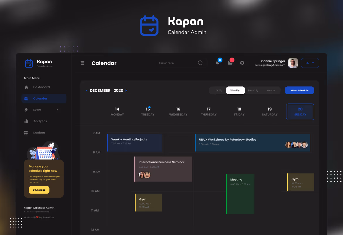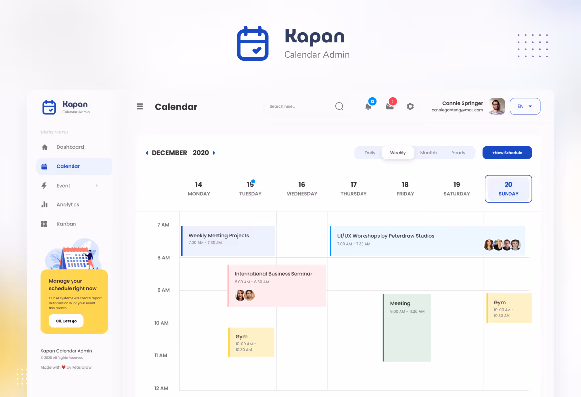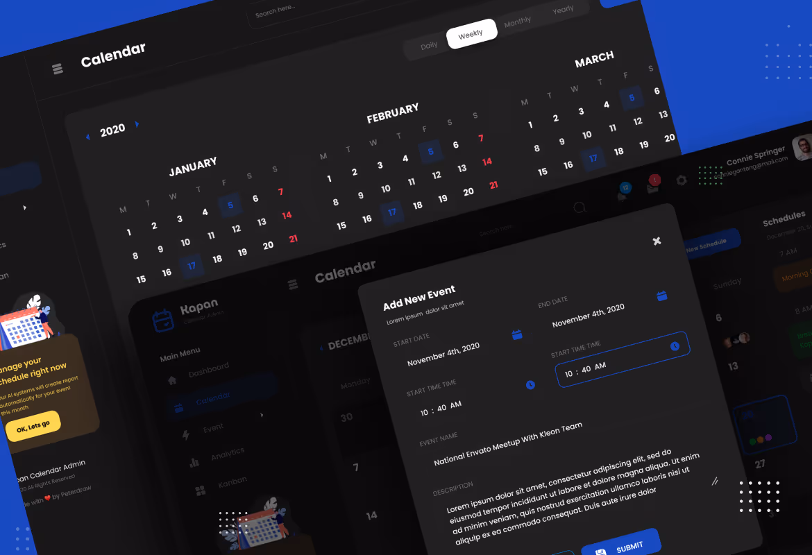 Modern dashboard User Interface design template for a calendar admin. This template is ideal for calendar apps, event apps, project management app, and any admin dashboard website.