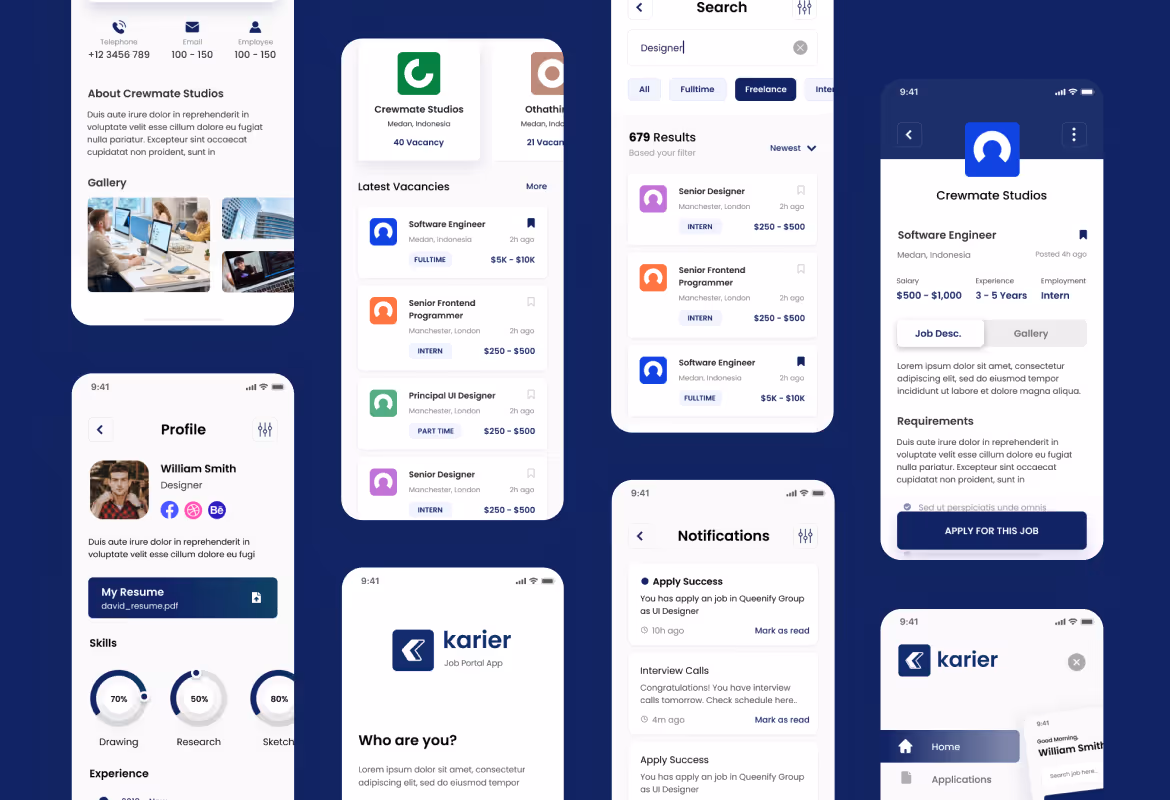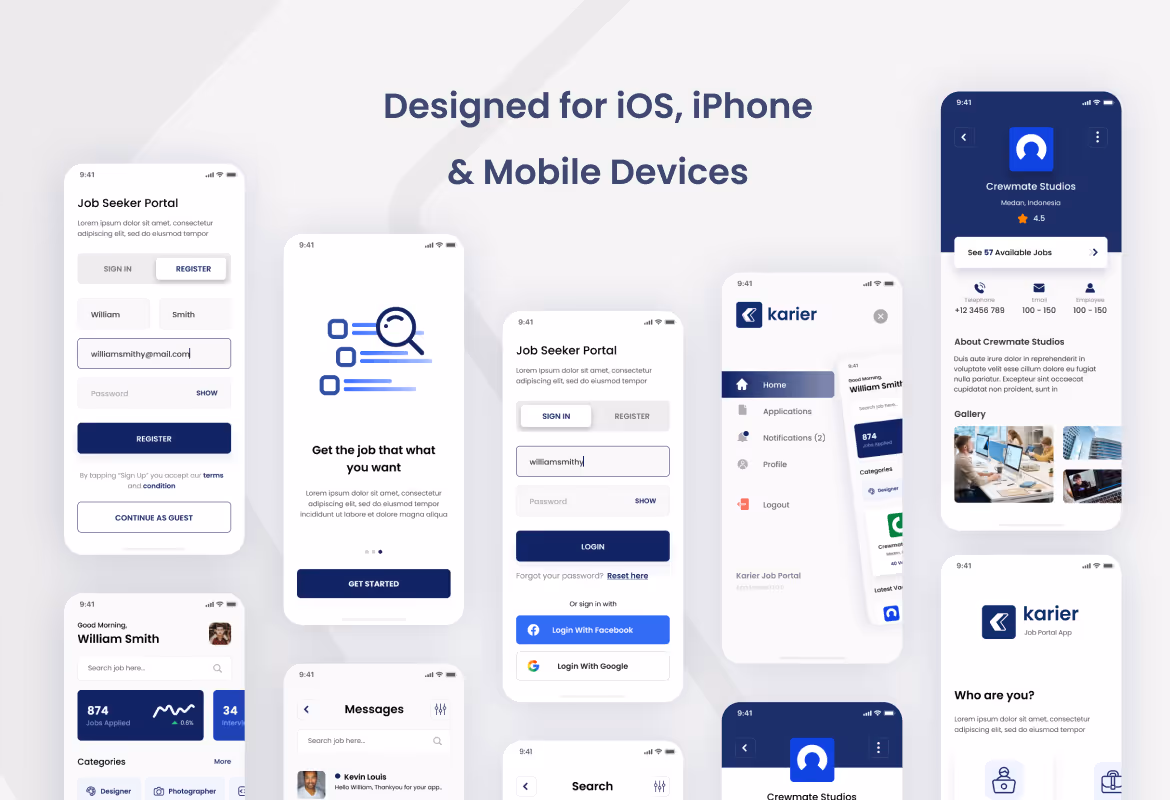 Modern iOS User Interface design template for a Jobs portal app. This template is ideal for a job portal app, hiring app, freelancer app, career app, and any job app. Make your app design looks stunning and eye-catching using this template. This template includes 15 unique and modern User Interface screens in PSD and Figma format. You can edit and customize easily using Adobe Photoshop and Figma.