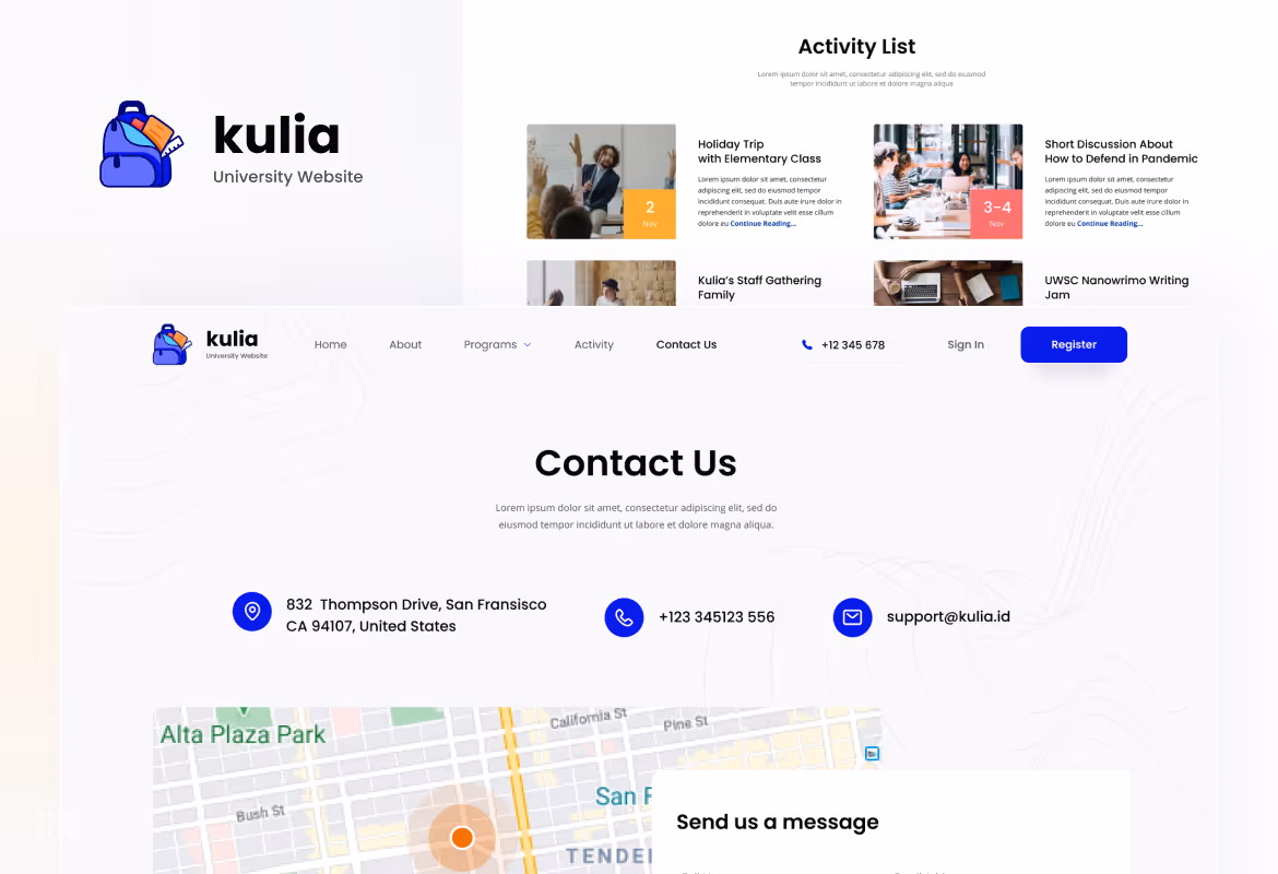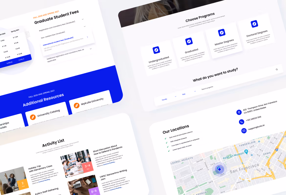 Modern website User Interface design template for a university website. This template is ideal for a campus website, college website, school website, and any education website. Make your website design looks stunning and eye-catching using this template. This template includes 10 unique and modern User Interface screens in PSD and Figma format. You can easily edit and customize using Adobe Photoshop and Figma.