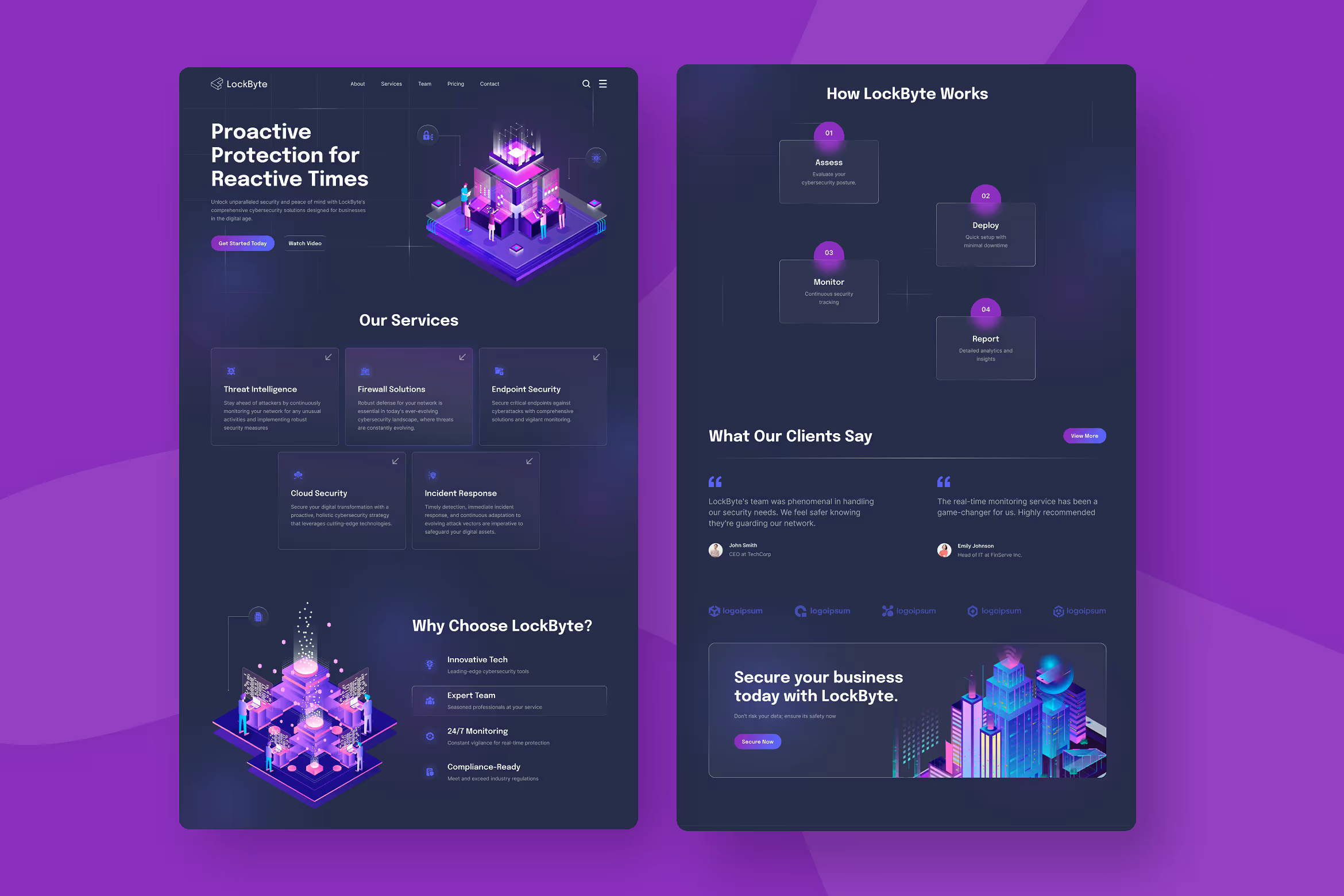Provide a convincing look that will invite more people to your website using LockByte, a dark professional cyber security landing page Figma template. The dark base color in this template makes it more trustworthy. Its neat and clean layout gives a refreshing look and a nice flow to explore. You can use it to make the cyber security website look better and nicer.