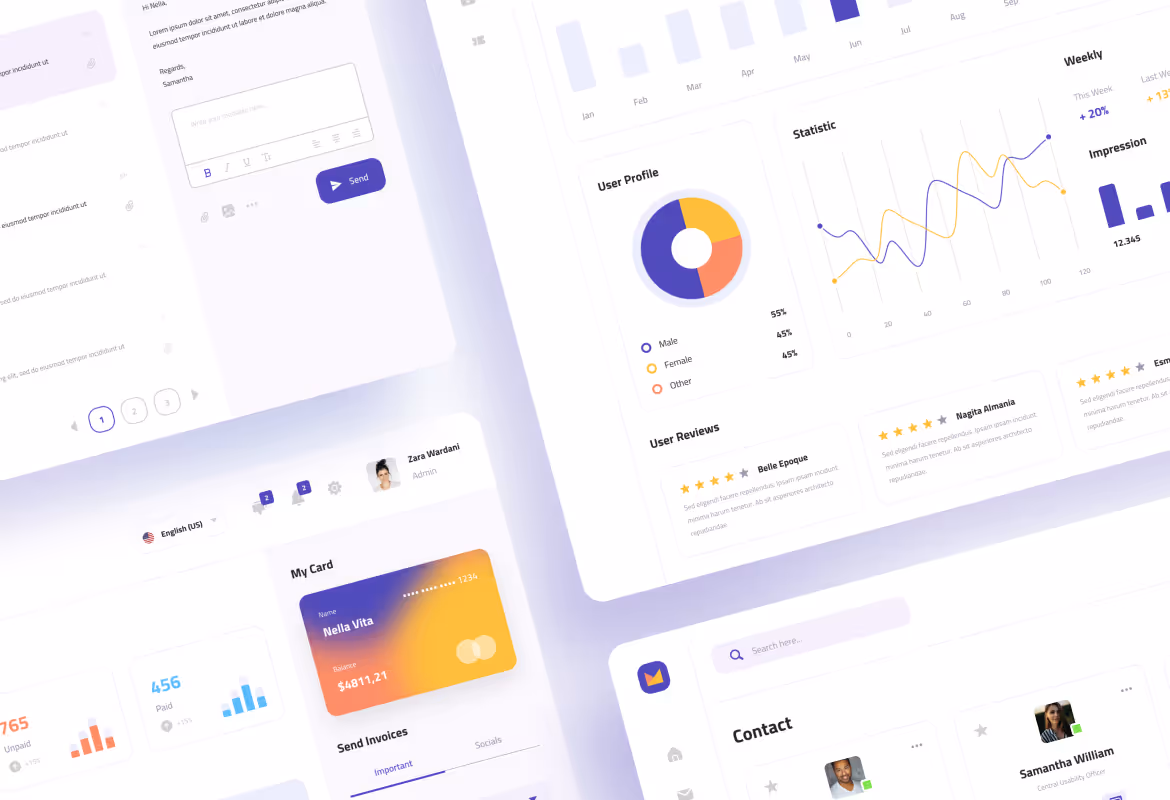 Arranging and organizing many tasks will be kind of a piece of cake if you have the right place to manage them. Help your admin to ease the burden of her/his tasks to manage the project, bank transaction, crypto transaction, responding the clients, or sorting the invoice by using Mandal, the clean modern admin dashboard template so it will the ideal choice for the company admin, email dashboard, Kanban dashboard, invoice admin, calendar dashboard, and any other admin website dashboard.