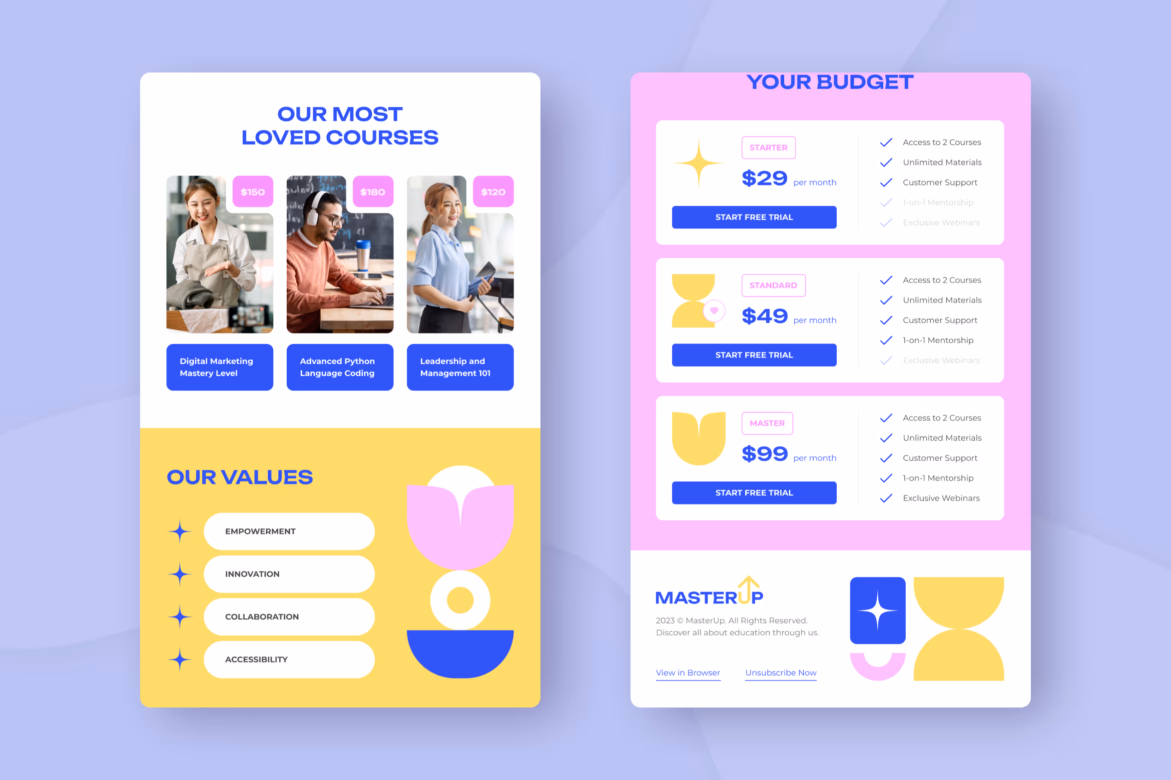 Reach your subscribers using this bright and appealing newsletter Figma template to promote your online course platform. Edit the template easily using Figma.